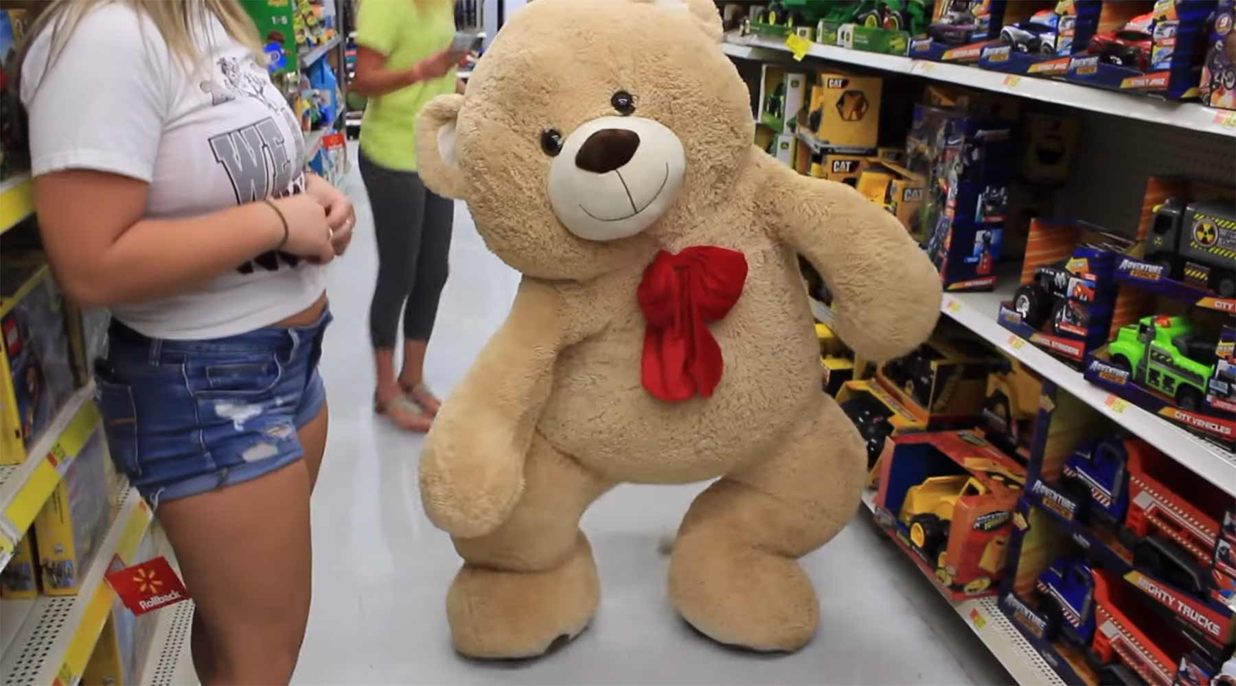 Die junge Dame hat sich einfach mal in einen riesigen Plüschteddy gepackt und darin einen Supermarkt unsicher gemacht. Das hat vor allem in den ersten Szenen des Videos so einiges vom animierten Film-Vorbild „Ted“. Muss herrlich skurril gewesen sein, das „Ding“ in den Gängen herumflitzen zu sehen.