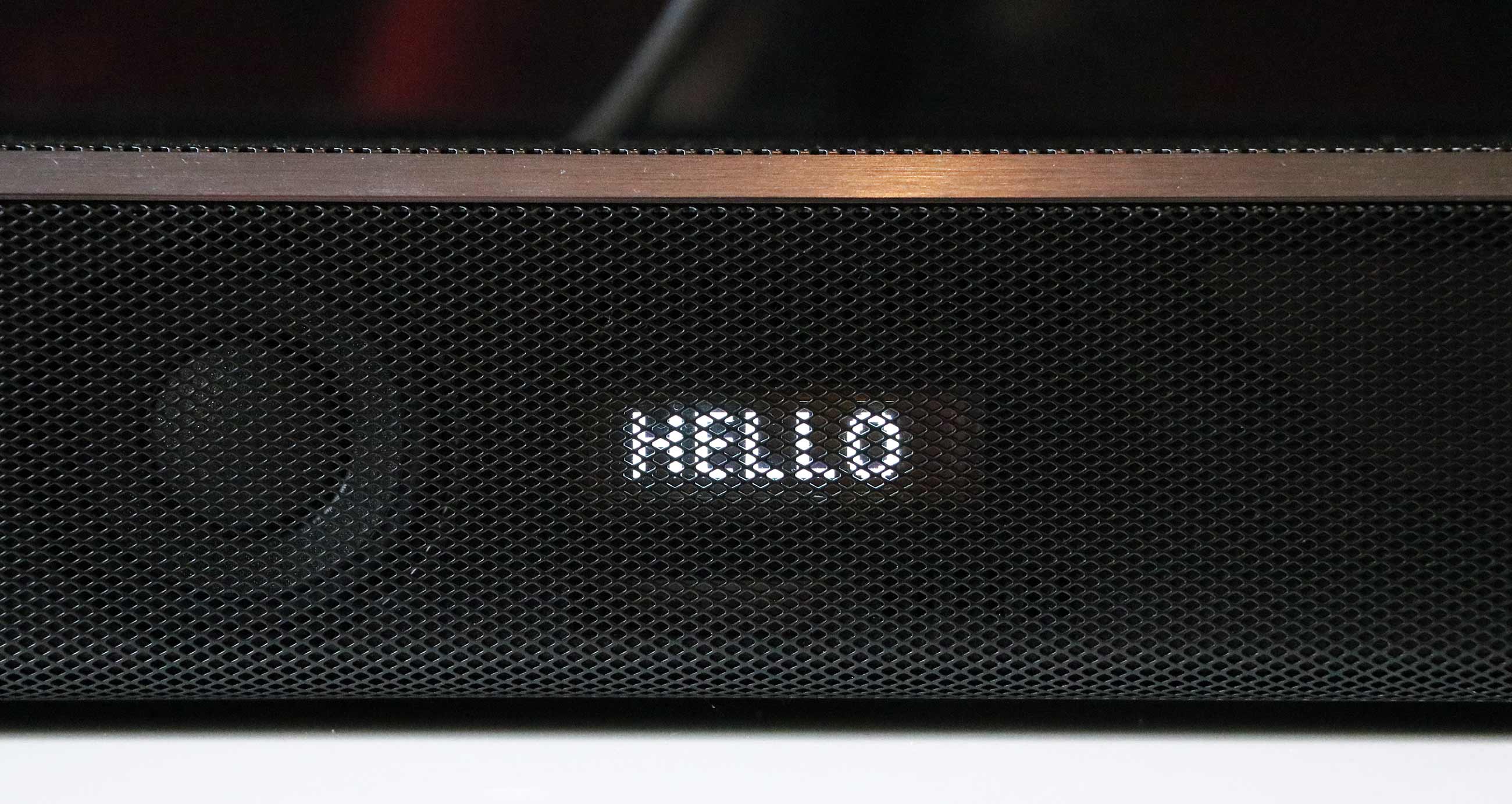 Ansonsten ist weniger mehr. Minimalismus, wo man hinschaut, was vor allem der Funktion geschuldet ist. Da Front- und Oberseite Lautsprecherausrichtungen beinhalten, bleibt wenig Platz für Spielereien. Die minimalistisch gehaltenen Steuericons an der Seite schauen schick aus, einzig störend finde ich das wenig hilfreiche Display vorne. Das sieht man zwar im Off-Betrieb nicht, was smart ist, im On-Betrieb leider auch nur wenig, schafft es gerade mal die fünf Buchstaben für das begrüßende „HELLO“ abzubilden. Alles andere ist Lauftext, meist viel zu kurz zu sehen und wirkt eingezwängt.