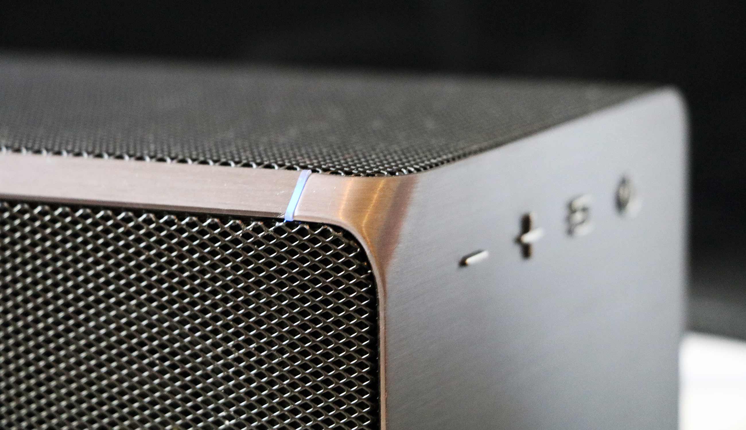 Auf den ersten Blick wirkt das Kernstück der Soundbar etwas langweilig. Aber was will man bei liegenden Langlautsprechern auch großartig evolutionieren? Betrachtet man den Center Speaker im Detail, wird man durch eine hochwertige Verarbeitung und einen konsequent durchgezogenen Modern-Metal-Look überzeugt. Schlicht, monumental und gewichtig. Das schaut nicht nur nach Qualität aus, das fühlt sich auch so an.