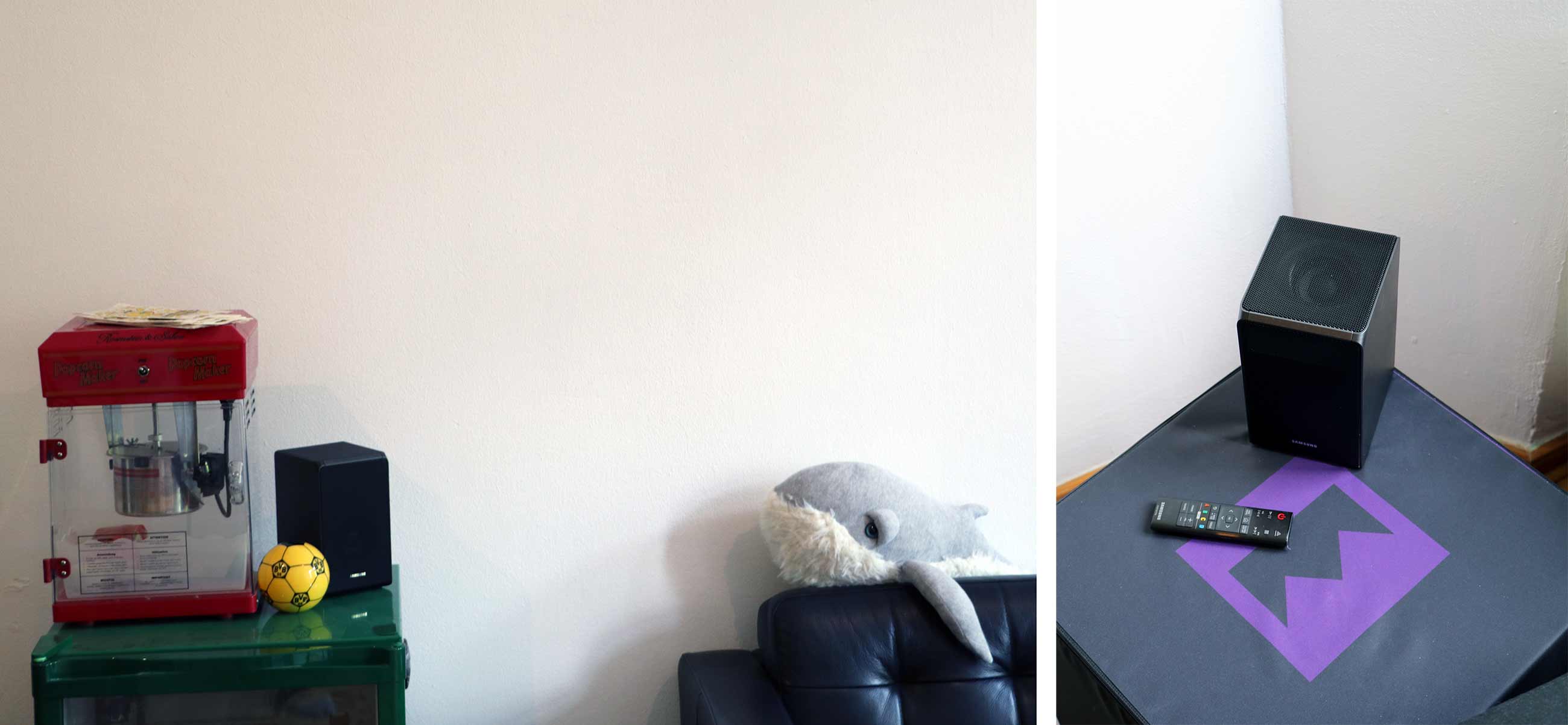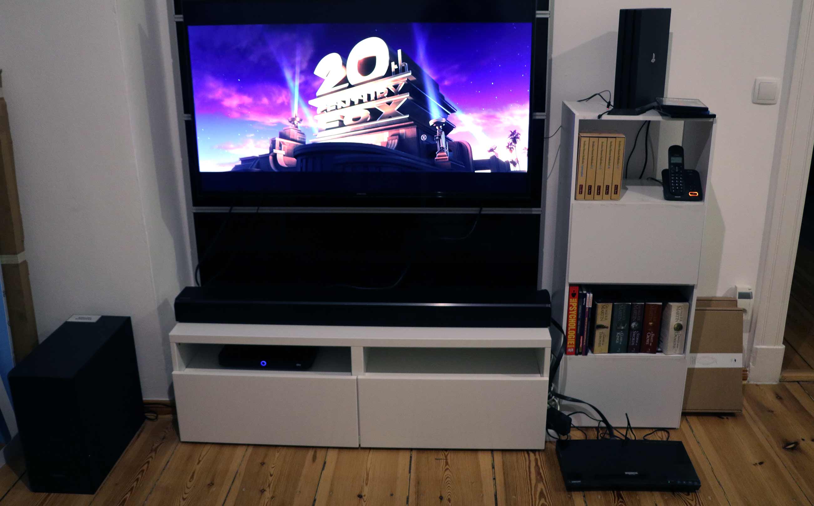 Mein Setup: Center Speaker unter dem Fernseher, Subwoover links daneben, Rücklautsprecher links und rechts vom Sofa. Los geht’s!