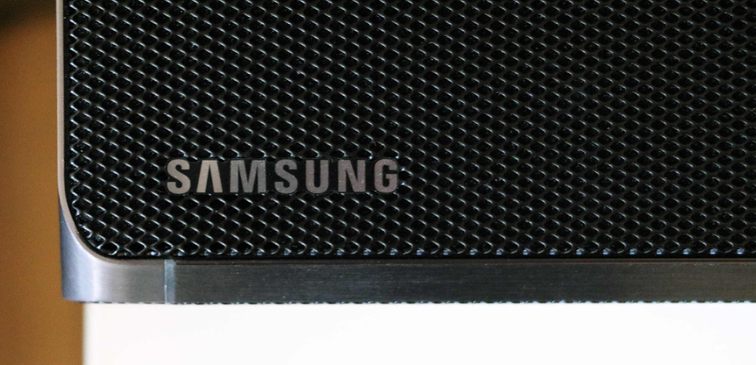Die weiteren Speaker sind nochmals unauffälliger gestaltet. Die Rücklautsprecher besitzen analog die Metallgitter-Membran zur Schall-Auslassung, der Subwoover ist ein sehr clean ausschauender Block, den lediglich ein „SAMSUNG“-Schriftzug ziert. Unspektakulär, aber Soundsysteme sollen ja vor allem gut klingen und klassisch elegant und unaufdringlich ist da nicht die schlechteste Variante für den Look.