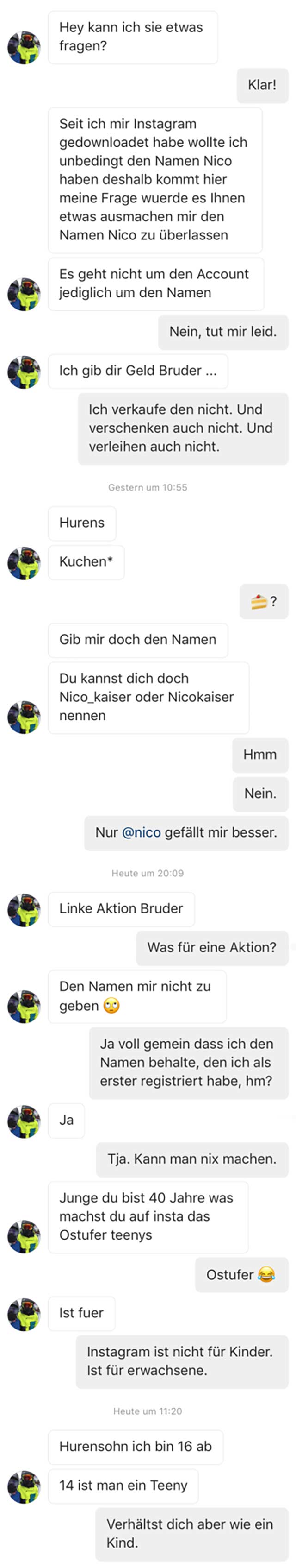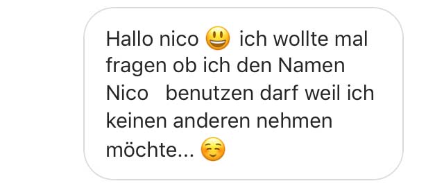 Wer früh bei Social Networks am Start ist, hat das Glück, sich seinen Username mehr oder weniger frei aussuchen zu können. Nico Kaiser aus Wien/München konnte schlicht seinen Vornamen @Nico anmelden. Natürlich kommt da schon einmal Namensneid auf und einige Anfragen für seinen so schön unkompliziert-kurzen Nickname laufen ein – die er alle auf einem Tumblr gesammelt veröffentlicht. Da ist alles dabei – von nett-verständlicher bis total respektloser Anfrage.
