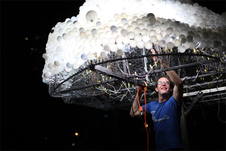 Sehr sehr schön. Es gibt jetzt übrigens auch ein Video. http://blog.dtoday.de/neonroehren/2012/09/cloud-interaktive-wolke-aus-6-000-gluhbirnen/ leider etwas unspektakulär