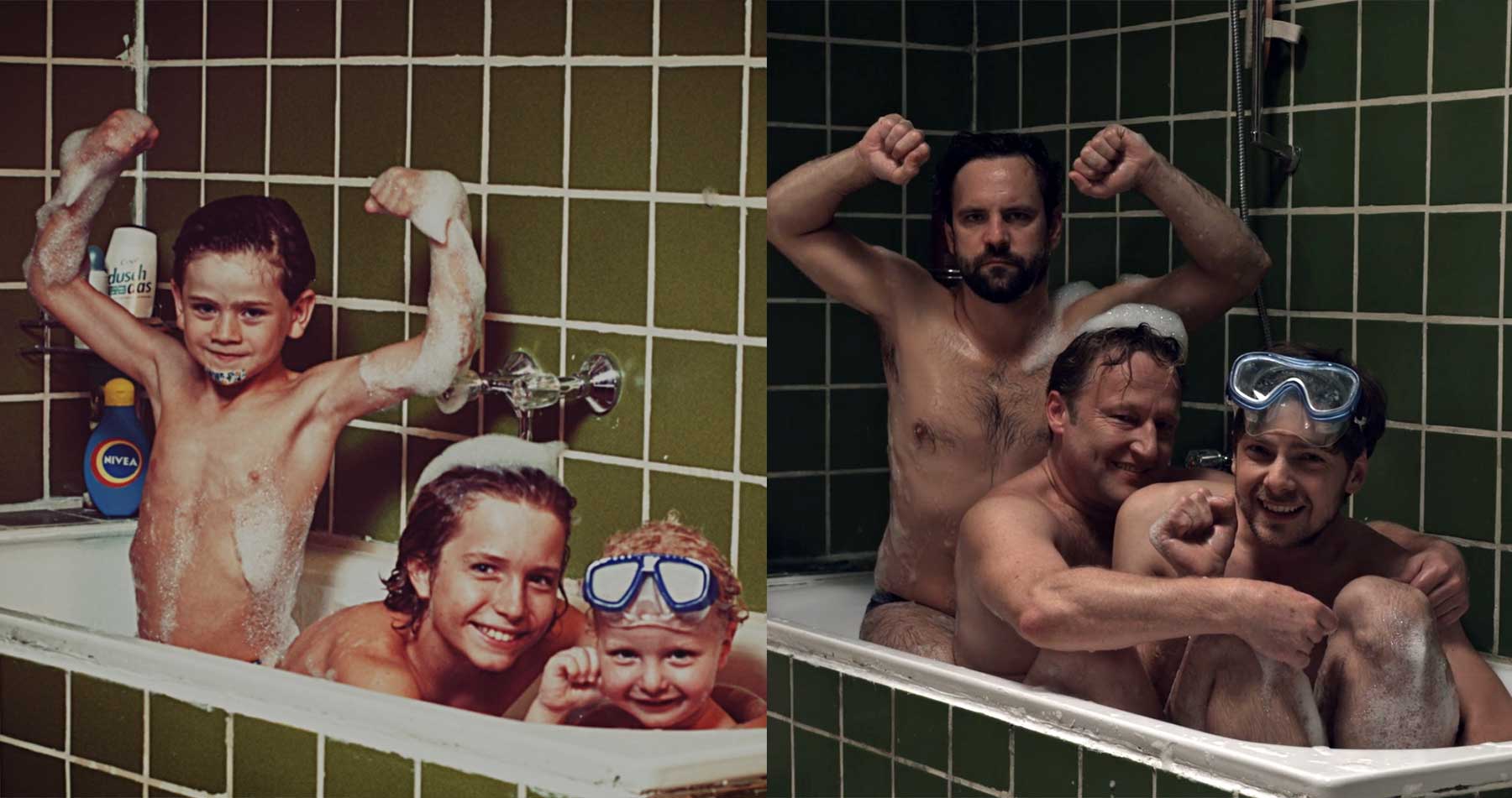 Diesen seit einigen Jahren existenten Kreativ-Trend, alte Kinderbilder möglichst genau nachzustellen, habe ich ja schon immer gemocht. Das lässt einen mit der Vergangenheit konnektieren, entfacht Nostalgie, Freude und Kreativität zugleich und sorgt für alle für Unterhaltung. Nicht nur beim Anschauen, sondern auch beim Versuch des Nachstellens, sollte man meinem. Im Kurzfilm „Die Badewanne“ von Tim Ellrich bekommen wir jedoch gezeigt, dass ein solches innerfamiliäres Treffen im Bad auch durchaus Differenzen in Meinungen und Lebensentwicklungen von Geschwistern aufzeigen kann. Und auch wenn es sich hier lediglich um eine fiktionale Produktion handelt, würde ich gerne weitere echte Making ofs zur Entstehung solcher Früher-Heute-Bildmotive zu sehen bekommen.