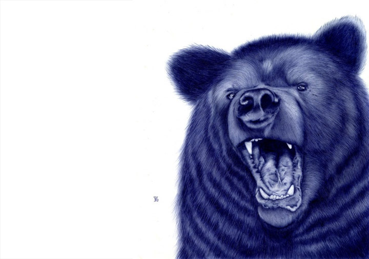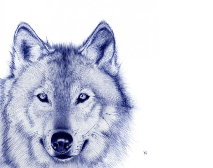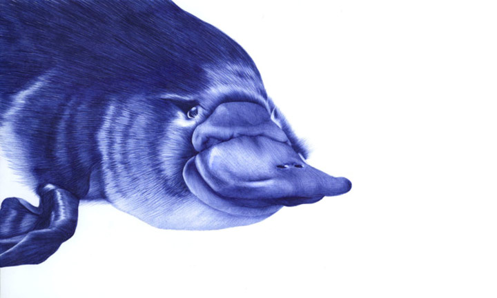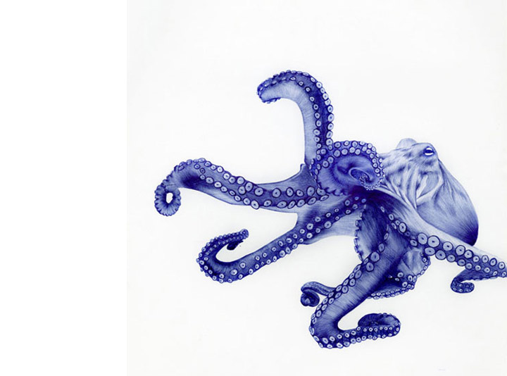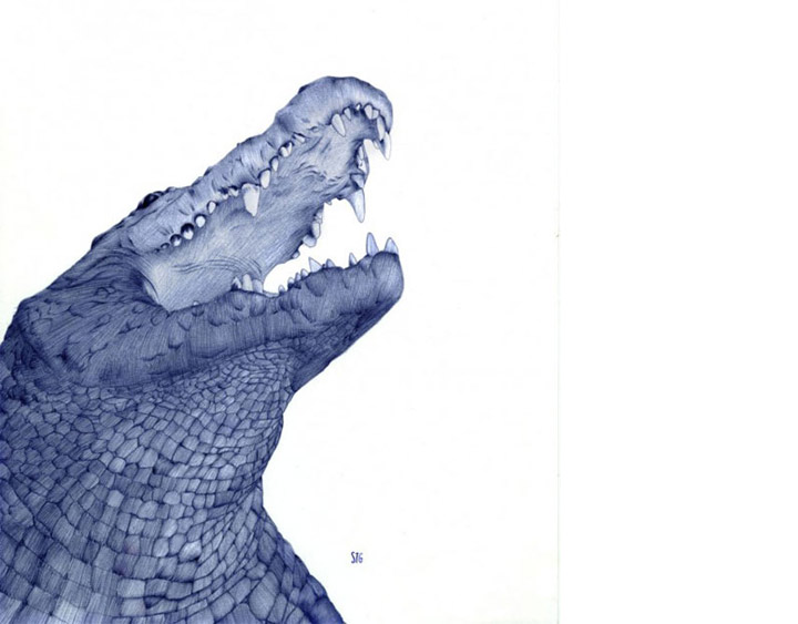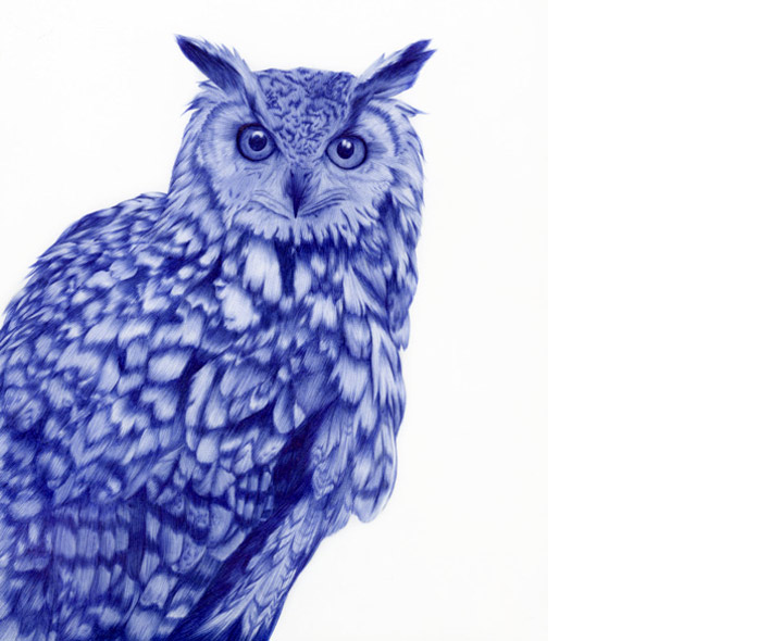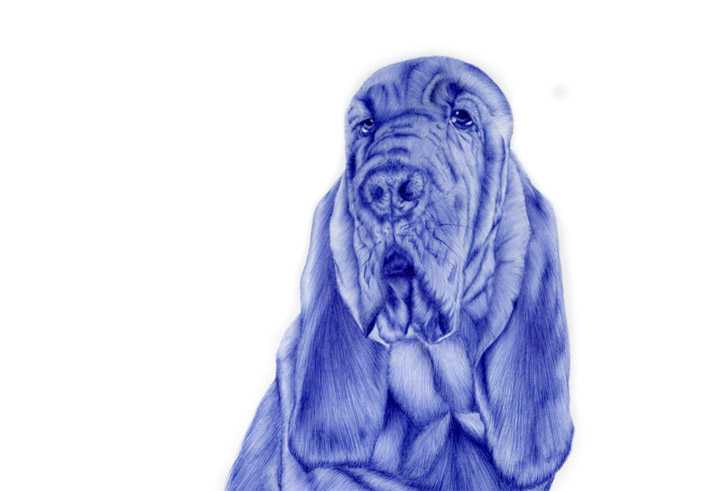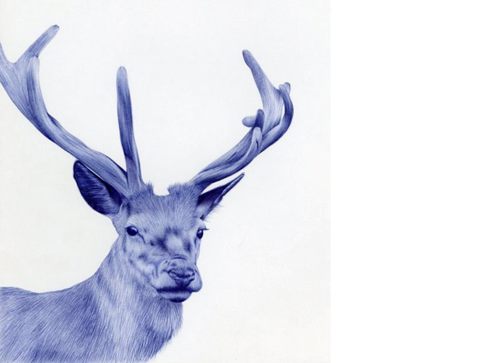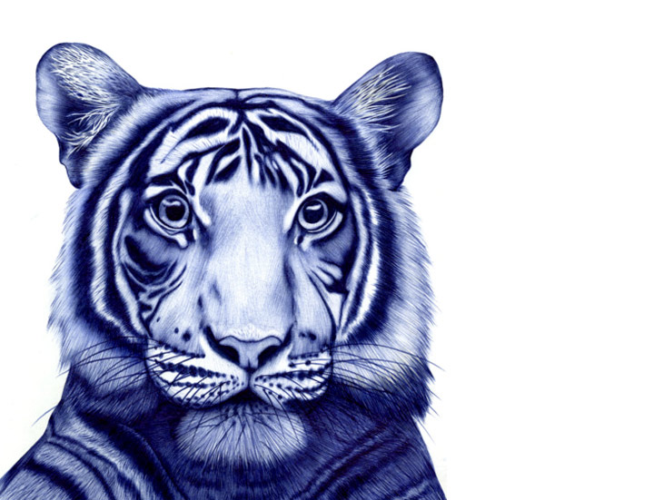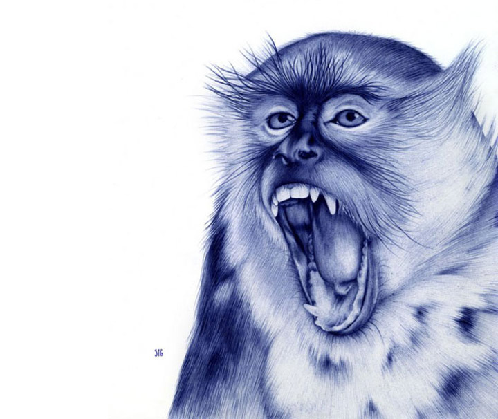 Ich finde es ja immer wieder beeindruckt, wenn Künstler realitätsnahe Bilder mit dem Kugelschreiber schaffen (wie bspw. zuvor hier). Der Stift verzeiht einfach keine Fehler und muss immer mit Bedacht und Koordination gedrückt werden. So, wie es Sarah Esteje schafft. Scheinbar mühelos. Die Französin malt ungemein gute Tierportraits in Blauton.