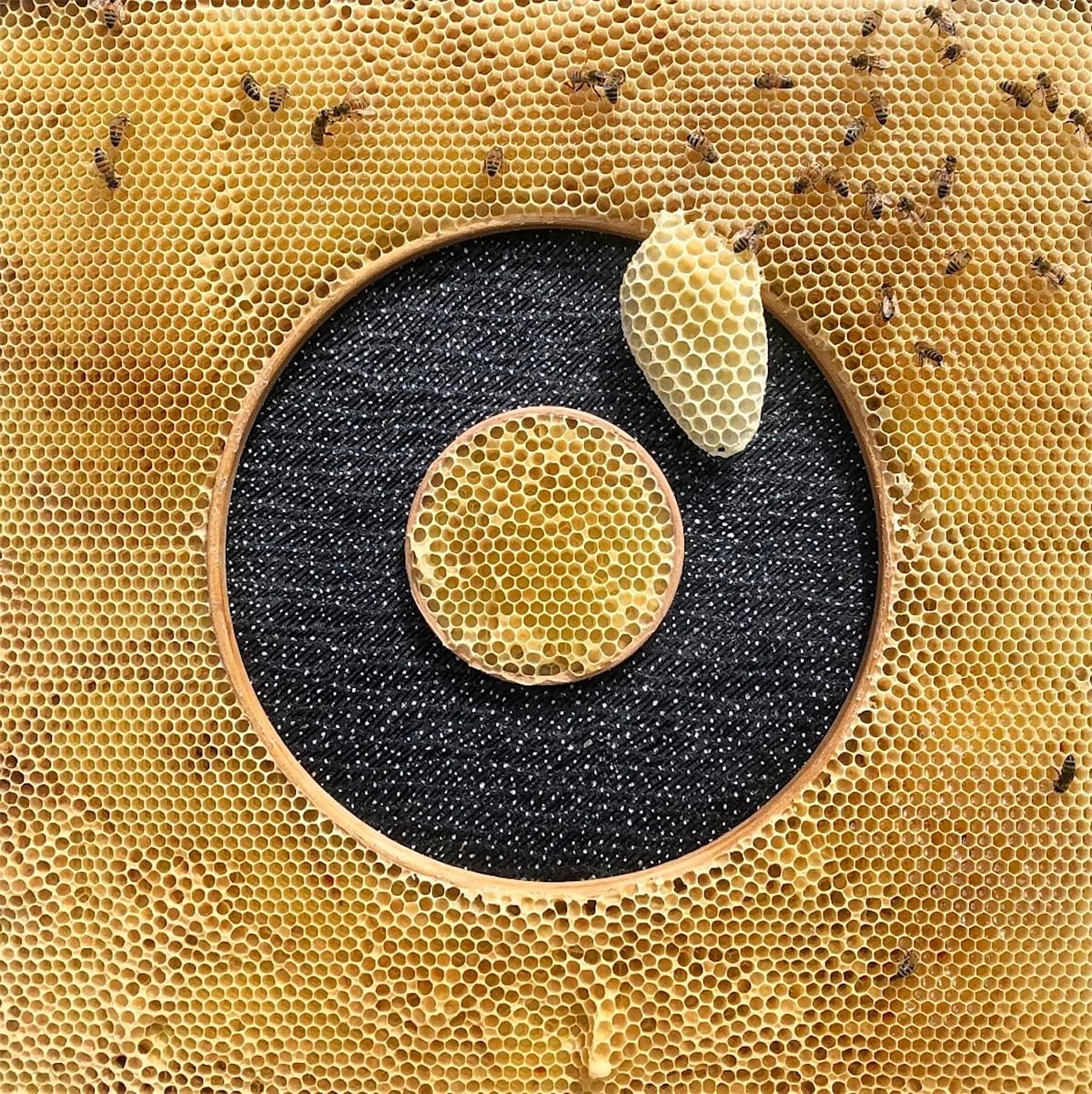 „I am currently working on an inter-species collaboration with local honey bees. This work begins in my studio with the creation of encaustic collages which are suspended in embroidery hoops. The hoops are then fixed to custom-made Langstroth hive frames, and placed inside honeybee hives where thousands of bees embed the work in comb. This project, like all my work, explores the boundaries of where humans collide with the natural environment, and imagines a more beautiful outcome of our encounter.“ (Artist Statement)