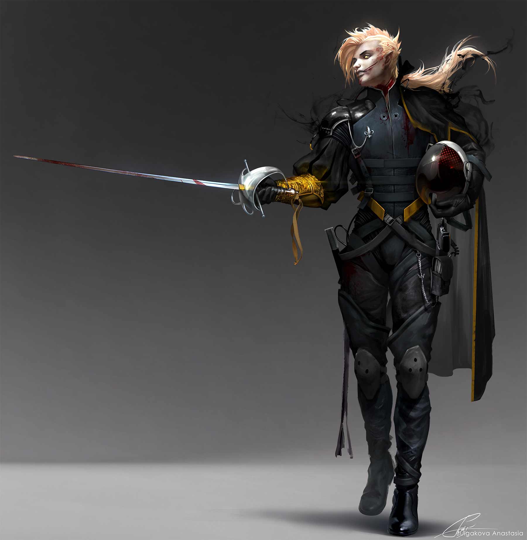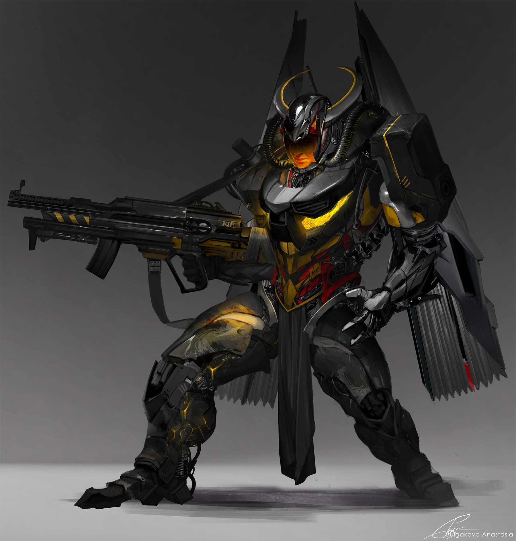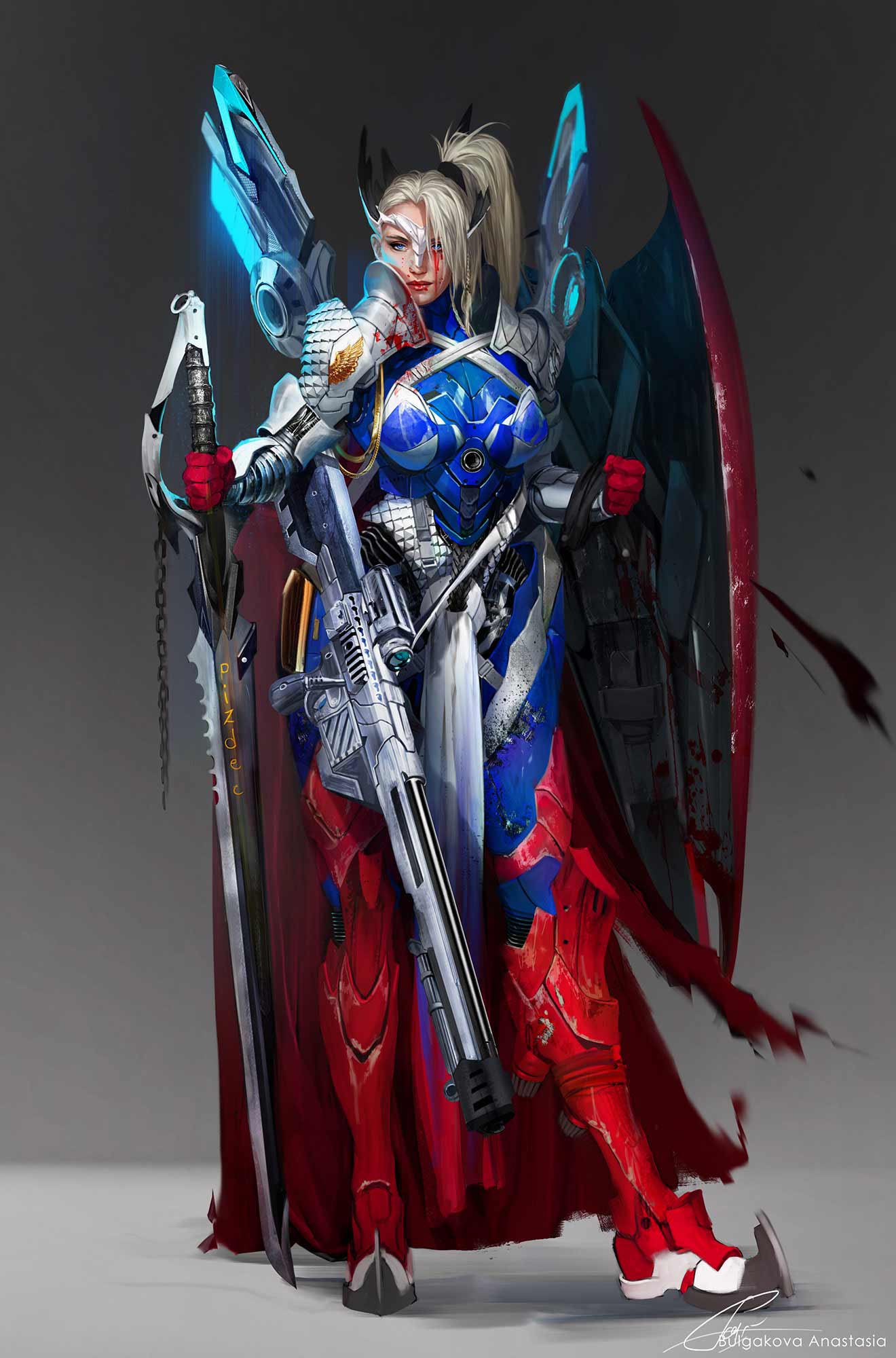 „He still is a Teutonic knight, and a big one at that ( if you can see a knight in this concept, of course). And high-tech. Extremely. Germany is considered to be clean, orderly and modern, so he wears a mechsuit. Something like an Ironman suit, but with more precision German engineering in it. And more stylish. Unlike earlier times, he mostly fights long ranged battles now, to keep the suit clean. Has unfoldable wings and thrusters on his back, like any proper mecha should.“
