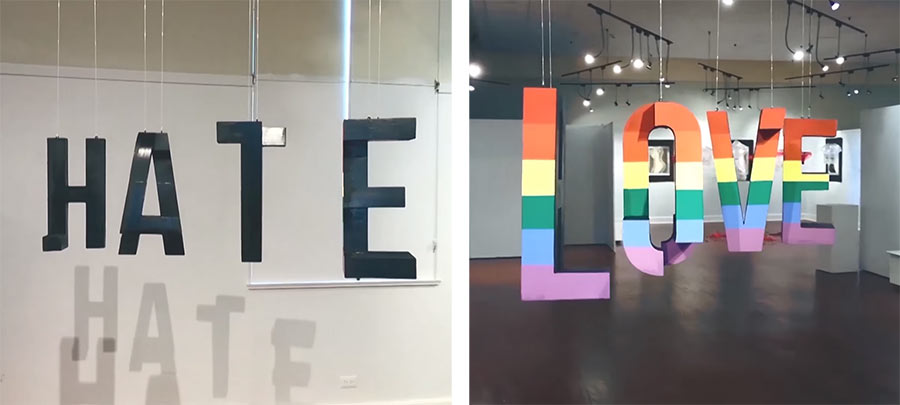 Ganz ähnlich geht das natürlich auch in den USA. In einer WIN Compilation gab es ein Kunstwerk, in dem schwarze Buchstabe, die „HATE“ gebildet haben nach einem Perspektivwechsel ein buntes „LOVE“ ergeben haben. Und selbst hier hat jemand den persönlichen Perspektivwechsel verpasst…