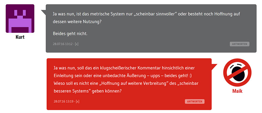 Da ich ein Verfechter des „Wie du mir, so ich dir“ bin, antworte ich auf patzige Kommentare gerne patzig und diskussionsfreudig, so dass sich ein längeres Gezanke um Nichtigkeiten ergibt. Vielleicht nicht das beste Beispiel, aber ich hatte einige gesammelt und möchte eine gewisse Bandbreite aufzeigen.