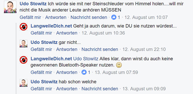 Anderes Thema: Die Verlosung eines Bluetooth Speaker-Systems. Frage zu der Kampagne, die einen an einer Drohne befestigten Lautsprecher zeigt: In welcher Situation würdet ihr so eine Sound-Drohne nutzen. Antwort: