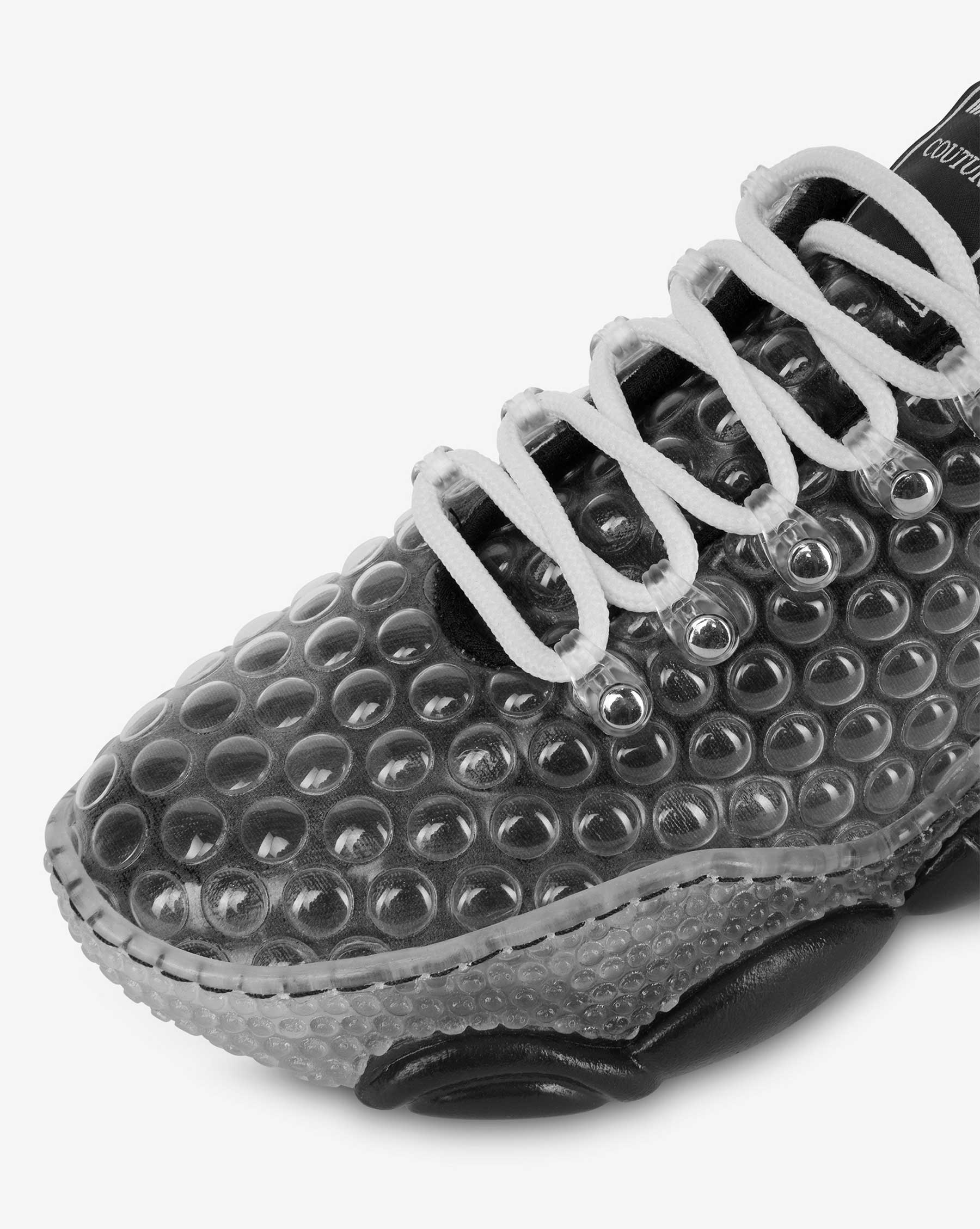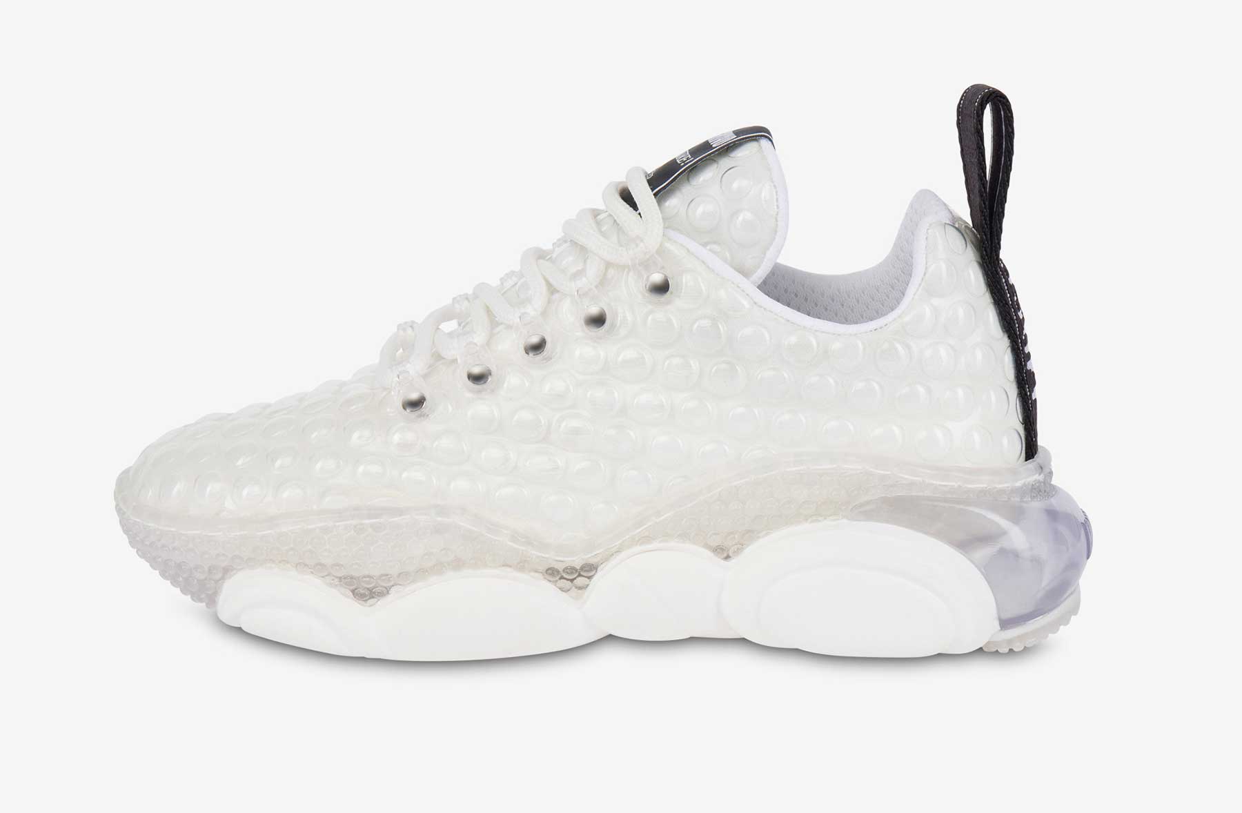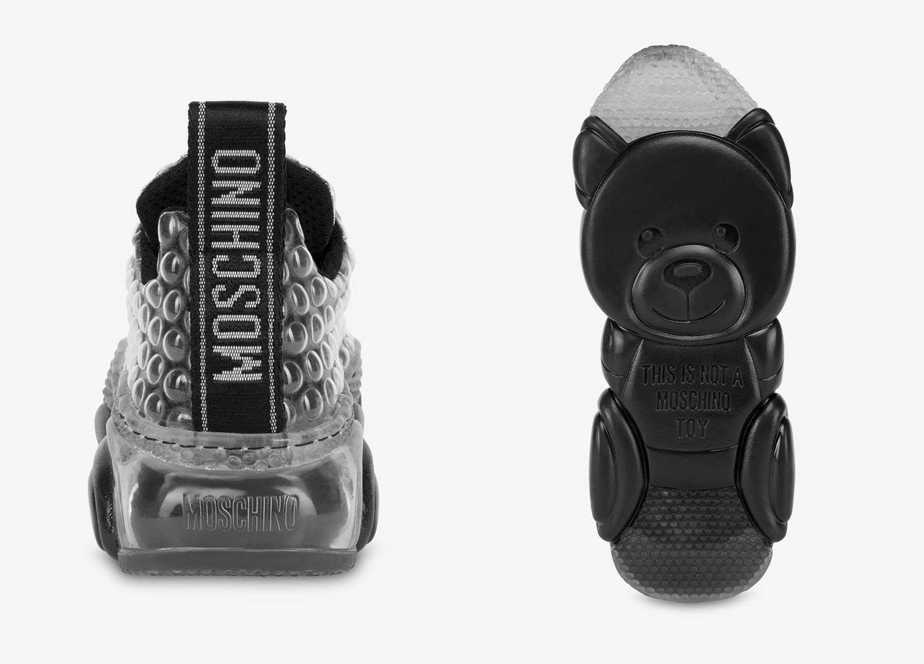 „Sneakers Teddy Bubble mit Obermaterial aus Stoff mit besonderer Pluriball-Effekt-Verarbeitung, Maxi-transparentes Luftpolster auf der Rückseite und dem unverwechselbaren Boden mit Moschino Teddy Bear-Form 100% Made in Italy.“