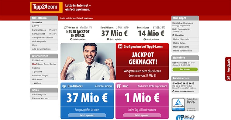 Im System zu tippen geht sehr angenehm. Direkt auf der Startseite wird man auf die aktuellen Jackpots hingewiesen und im Lotto-Bereich gibt es den klassischen Schein in angenehm zu bearbeitender Optik zu sehen. Die Einzelfelder sind entweder händisch oder per Zufall zu füllen. Zusätzlich kann man auch z.B. die Scheinnummer selbst bestimmen (was ich mit meinem Geburtsdatum gemacht habe).