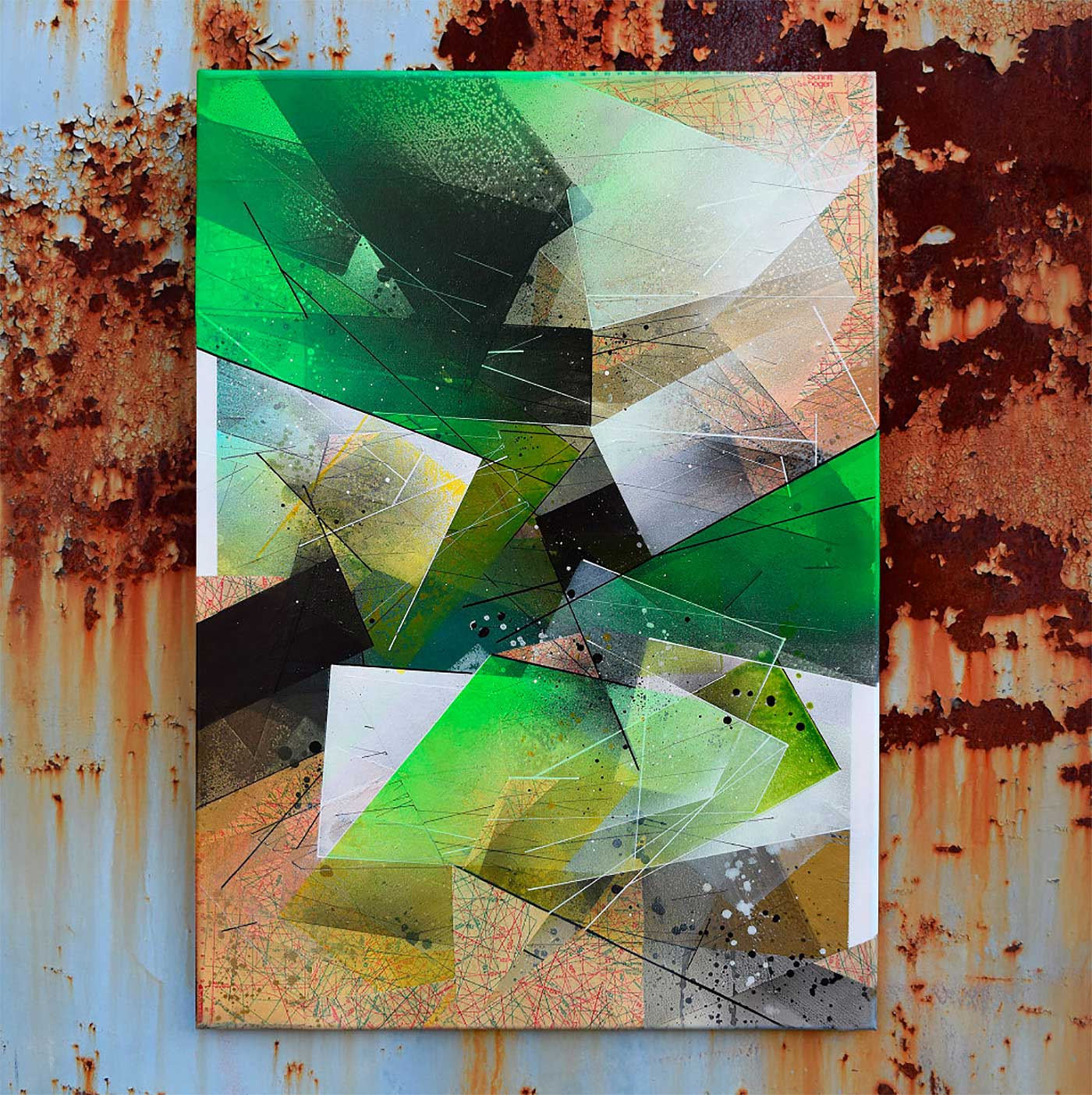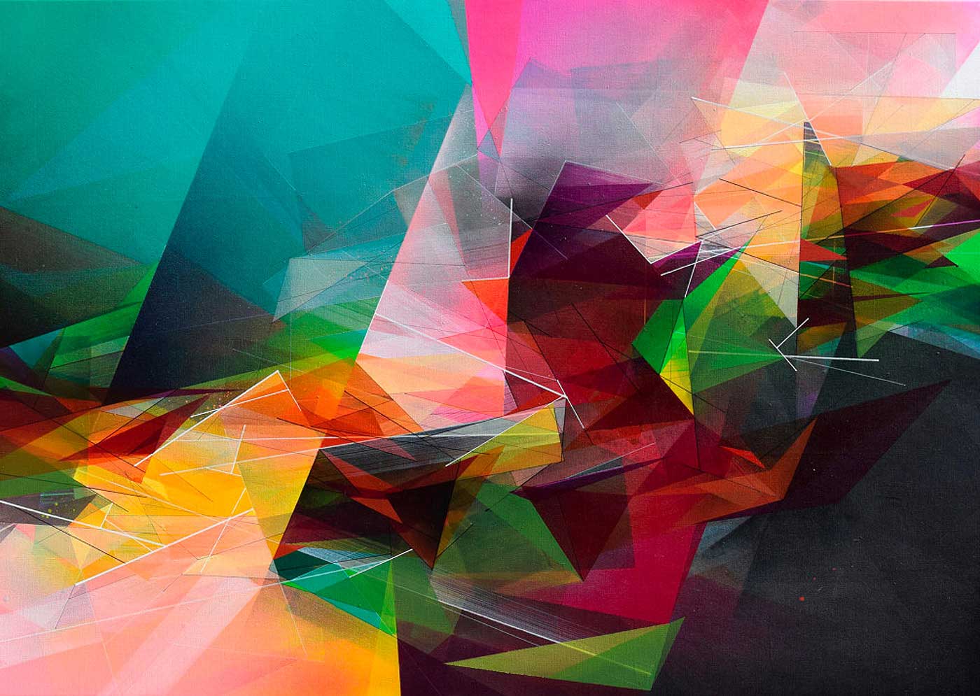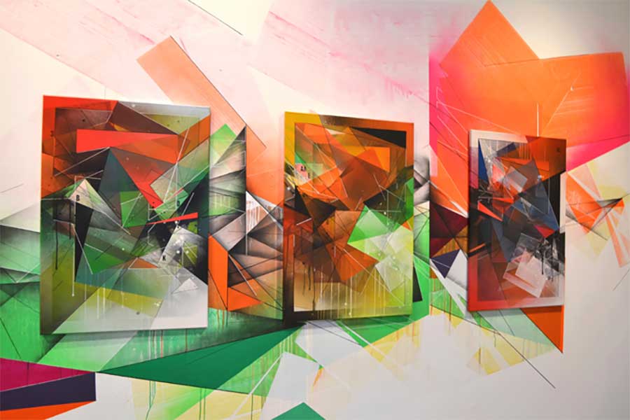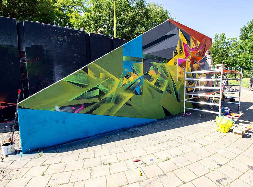 Der polnische Street Artist Bartek Świątecki erstellt dynamische Motive, die mit klaren Linien und knalligen Farben ein abstraktes Geometrie-Bild abgeben. Dabei schreckt er weder vor der klassischen Leinwand, noch von den großen Wänden der Städte zurück und weiß seine Arbeiten als Murals oder eher klassische Gemälde zu inszenieren.