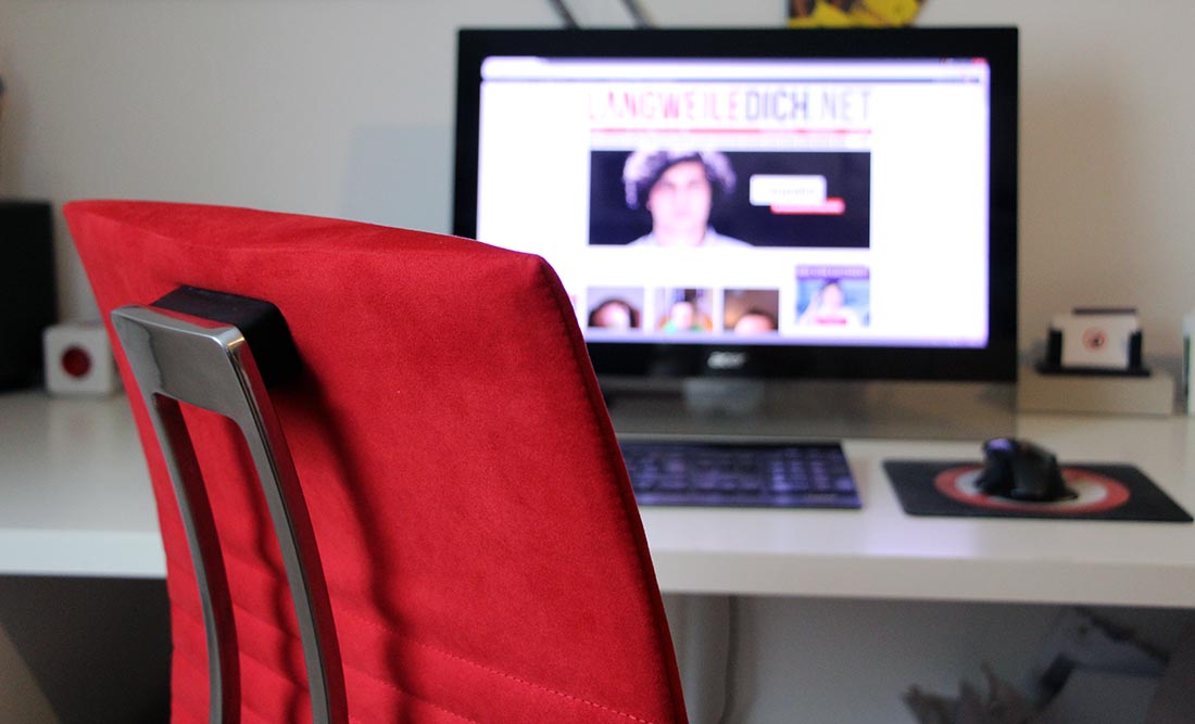 Da steht er – bereit, besetzt zu werden! Macht sich gut, das Zusammenspiel aus „Ferrari-Rot“, Chrom und Schwarz, quasi die LangweileDich.net-Farben im Rot-Schwarz-Weißen Büro. Das Design des 3Dee gefällt mir sehr gut. Auf das Wesentliche reduziert, eine elegante Formenführung und insgesamt ein sehr hochwertiges „Feeling“. Der Mikrofaser-Stoff fühlt sich wunderbar an, das Gewicht wirkt schwer und wertig und die Kipp- und Einstellungs-Schalter sind angenehm unauffällig verbaut (Höhenverstellung an der Seite, Rückenlehnenjustierung ist quasi der hintere Metallbügel).