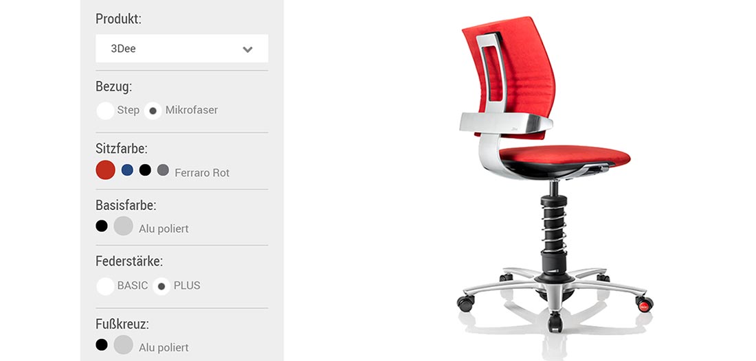 Auf aeris.de gibt es den Produktkonfigurator. Je nach Modell können unterschiedliche Optionen eingestellt werden. Beim 3Dee war das vor allem der Bezug und die Farbe der Teile, aber eben auch die Federstärke. Diese variiert je nach gewünschter Sitzhöhe: