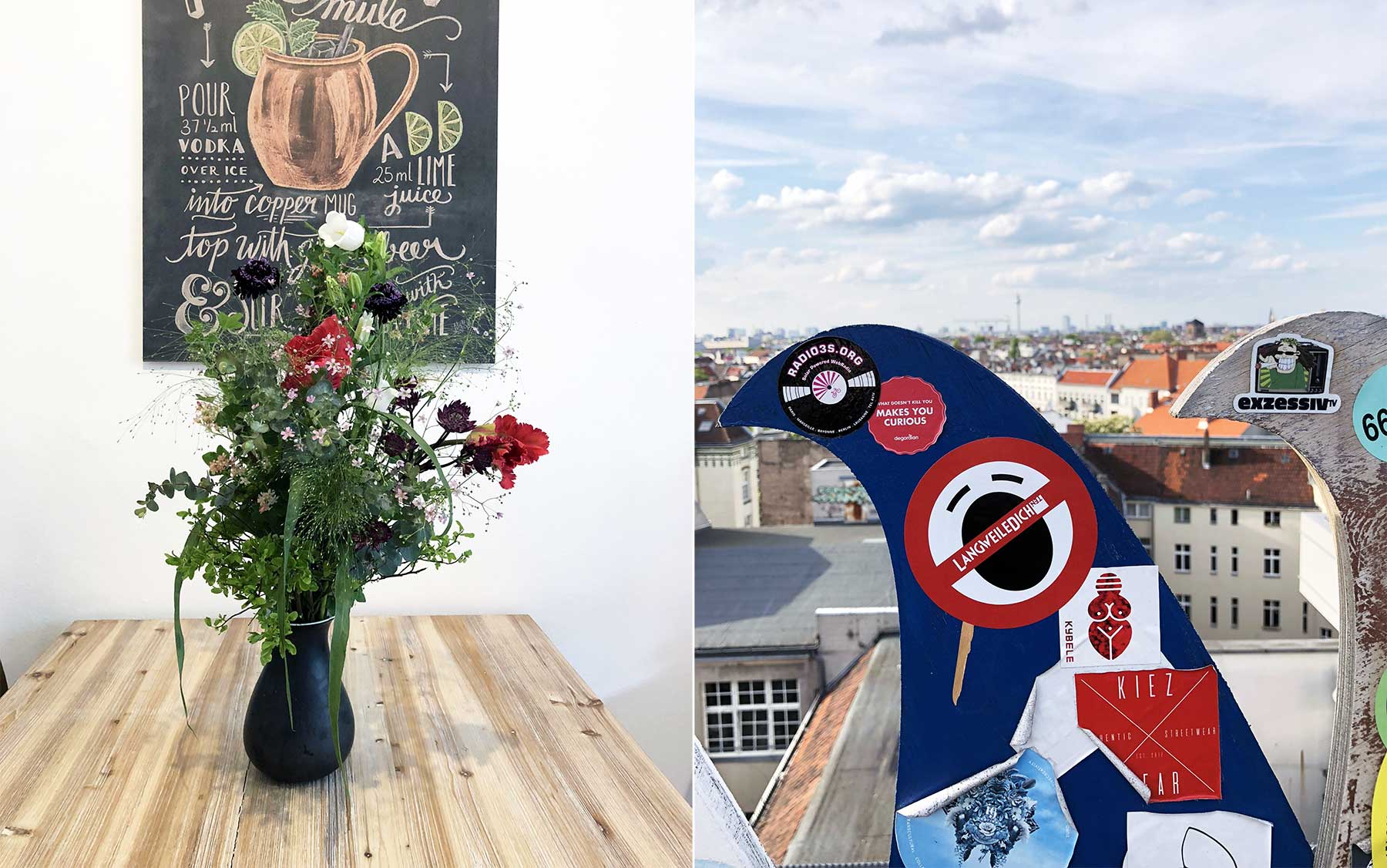 Freitag gab es zum lockeren Auftakt ein leckeres Frühstück im „Tour les Jours“ bei uns in der Nähe und dann ein Besuch bei uns in der Wohnung. Danach haben wir etwas die Gegend am Hackeschen Markt erkundet, um anschließend die Kuchen-Probierplatte im „Barcomis“ zu futtern. Den Nachmittag haben wir auf dem „Klunkerkranich“ verbracht und neben der Sonne auch den tollen Ausblick über Berlin genossen. Passt!