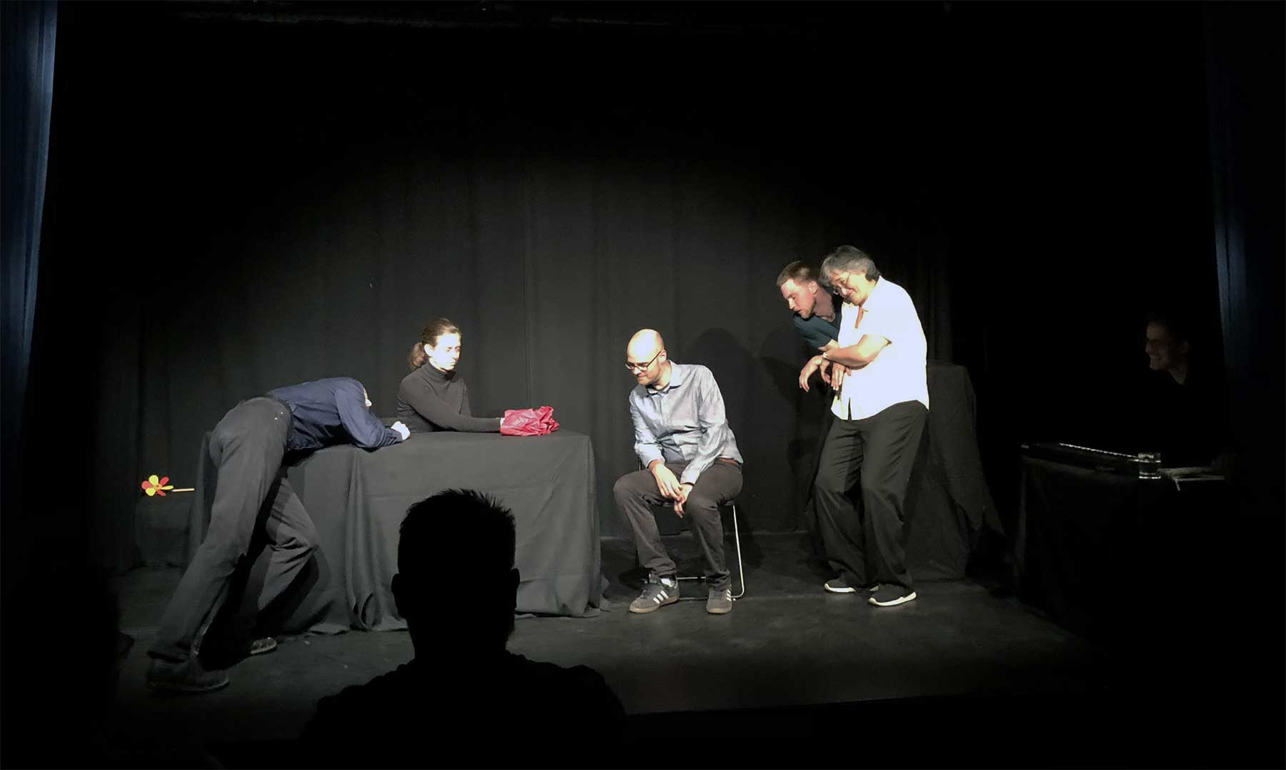 Abends gab es dann eine weitere Premiere für meine Oma: Zum ersten Mal hat sie arabisch gegessen – und das stilecht in Neukölln. Das kam zwar so mittelprächtig an, bis auf die Falafel war der Laden aber auch nicht wirklich der Tollste. Abends haben wir dann noch das Impro-Theaterstück „Die spontane Welt der Dinge“ besucht. Genauer gesagt die Premieren-Vorstellung vom Theater ohne Probe. Bis auf ein paar Längen zwischendrin war das durchaus gelungene Unterhaltung für Klein bis Groß, hier im Bild zu sehen ist gerade die Szene, in der Regenschirm Eduard zu Gast in der Selbsthilfegruppe für fehlende Körperspannung ist.