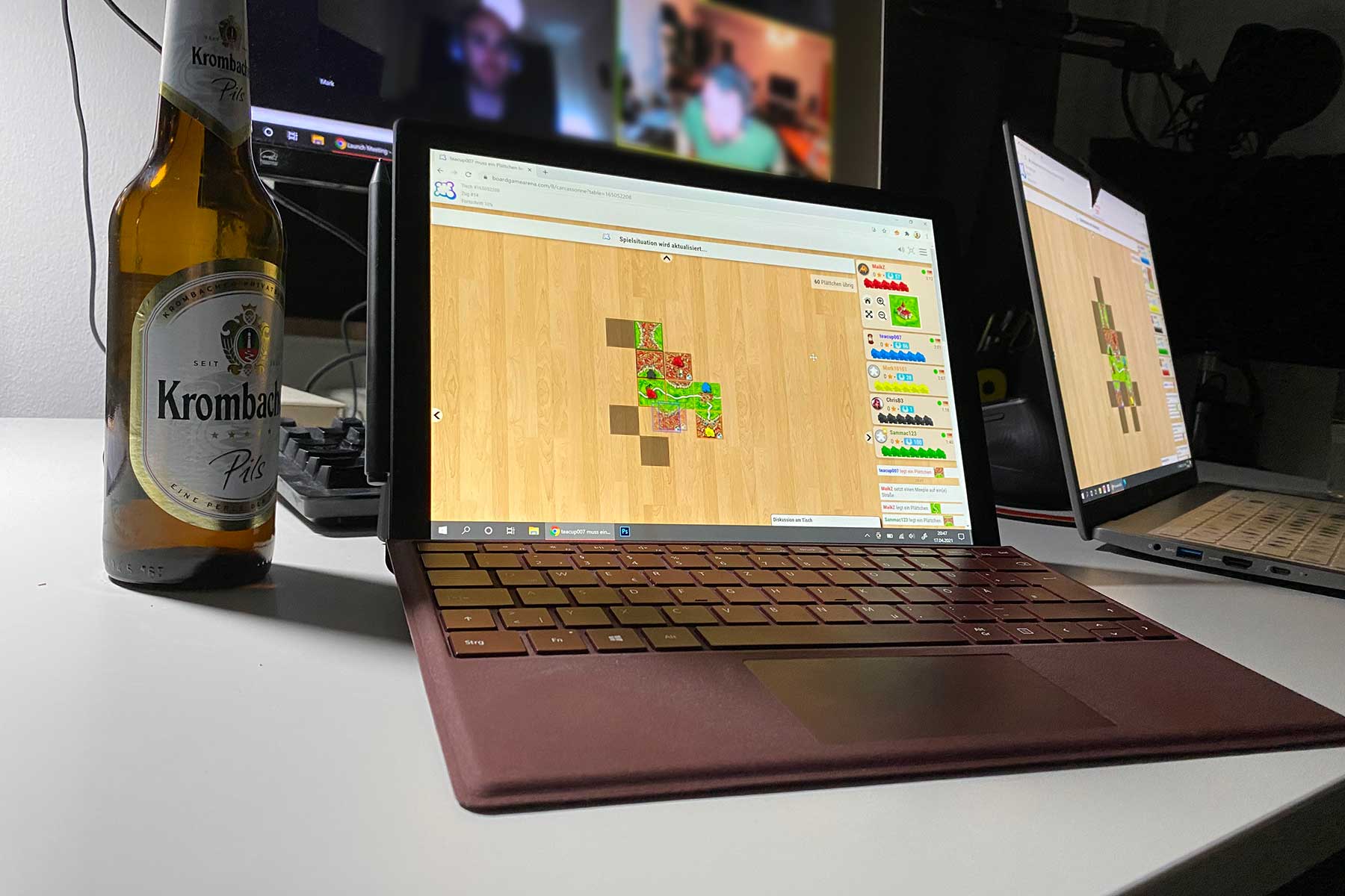 Neben „HAPPY BIRTHDay SAM“ gab es direkt mal zwei weitere Spieleabende. Zum einen haben wir endlich unseren eigenen Jackbox-Abend geschafft. Also, erstmal testweise zu viert, was sich als etwas zu wenig (zumindest für die meisten Minispiele) herausgestellt hat. Bei „Quiplash“ haben wir das Kunststück geschafft, dass in einer Runde jedes Duell 1:1 unentschieden ausgegangen ist, so dass der Zwischenstand recht eintönig ausgefallen war. Aber es hat dennoch Spaß gemacht und wir konnten unsere beiden Neu-Mitspielenden denke ich doch davon überzeugen, dass wir das öfter machen sollten. Und es war auch mal ganz spannend, selbst der zu sein, der das Spiel aufsetzt, statt irgendwelchen Leuten auf Twitch dabei zuzuschauen.