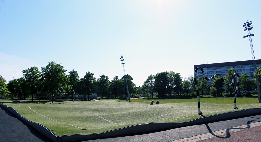 Eine Installation mit einem hügeligen Fußballplatz und an Hogwards erinnernde Tore. So dürfte Paul Gascoine zu aktiver Zeit den Platz gesehen haben… Konnten leider nicht drauf spielen (was aufgrund der unsagbaren Sommerhitze auch neben der akuten Beinbruchgefahr keine gute Idee gewesen wäre), aber macht bestimmt Spaß. Und ja, da wird tatsächlich drauf gespielt.