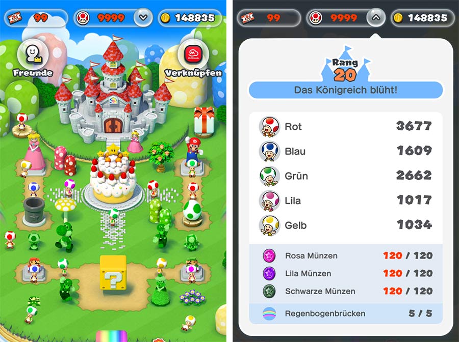Aber kommen wir zum wirklich Konkreten. Zum Beispiel „Super Mario Run“. Nachdem ich etliche Zwischenstufen zuletzt als erklommen vermeldet hatte, kann ich jetzt mit Fug und Recht behaupten: FERTSCH! Alles durch. Alle Münzen in allen Levels ergattert und das Limit an Toads erreicht, die zudem in ihrer Farbzusammensetzung dazu genügen, sämtliche Special Items erwerben zu können. Und es fühlt sich komisch und leer an, dass ich in meinen kleinen Pausen, in denen ich immer mal zum Smartphone greife, nun nicht mehr den kleinen Klempner hüpfen lasse, aber eben auch toll, weil sich so ein Vollständigkeitsgefühl einstellt. Das mag ich!