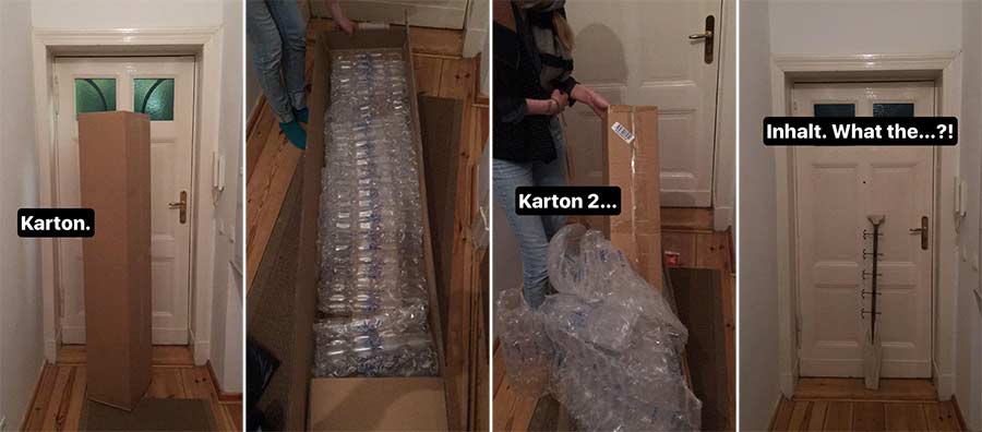 Aber ich will hier an Ostern nicht zu gefühlsduselig werden, daher die weiteren Dinge, die mich bewegt haben. Ein viel zu großer Karton für ein eigentlich kleines Ding. Das regt mich auf, weil es (A) die Umwelt belastet und (B) wir den ganzen Müll dann zu beseitigen haben. Dazu wurde das zweite Produkt der Bestellung (ein Spannbettlaken) in einem separaten Karton verschickt. Zeitgleich. Na, herzlichen Glückwunsch…