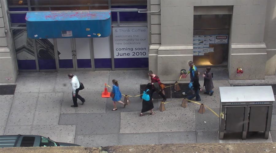 Rune Madsen, Scott Wayne Indiana, Nien Lam und Nikolas Psaroudakis haben in dieser 2010er Installation eine Runde „People Watching“ gespielt. Damit es noch unterhaltsamer wird, haben sie Passanten einige mit Flatterband verbundene Hütchen in den Weg gestellt. Und wie der Mensch halt so ist, wird in artiger Herden-Manier durchs Nadelöhr spaziert. Fast-zinierend. Fast.
