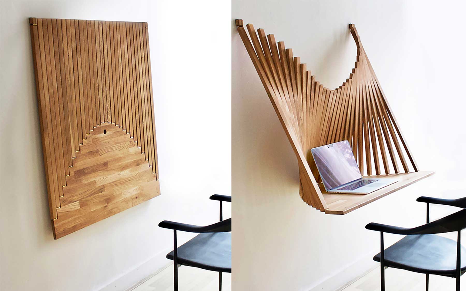 „The Flow Wall Desk acknowledges the potential of creating a desk inside one’s indoor environment. Only with one twist, it becomes a true joy to have as a separate working area. It can be subscribed as a piece of functional art that builds on Robert van Embricqs his Design track record of transformations in space. This one offers a part of the interior that shifts with time: a cozy workspace during the day becomes a compact wall hanging after being used.“
