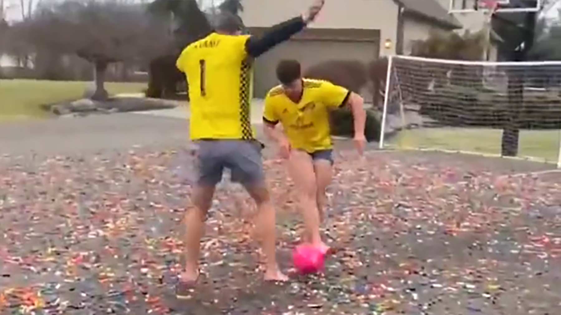 Kommen wir zum Sport! Weil Fußball mit einer Bowlingkugel den Schmerz eines Montages noch nicht vollwertig zu transportieren weiß, hat man kurzerhand das Spielfeld mit LEGO-Steinen übersät: