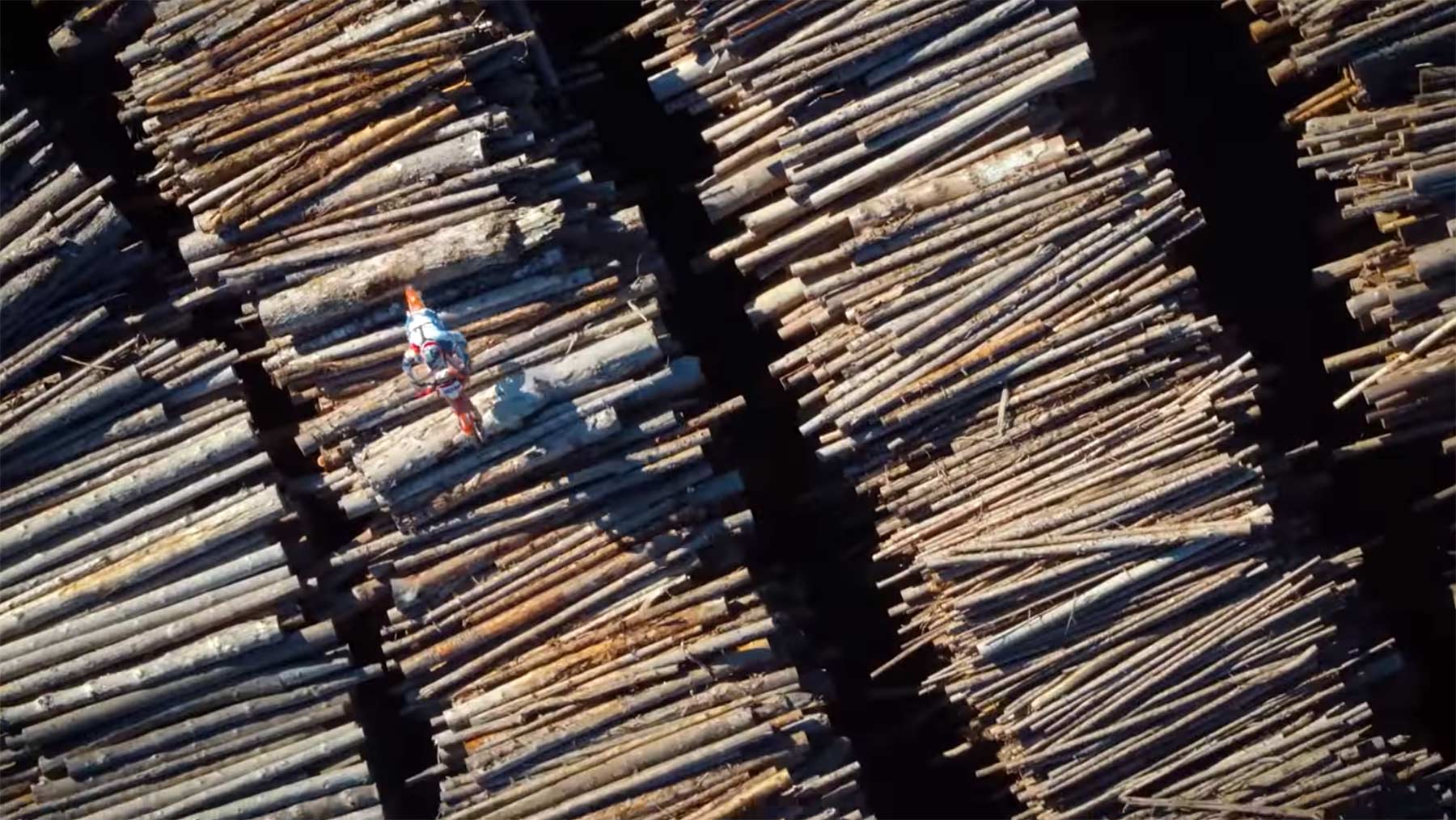 Junior Enduro-Champion Manuel Lettenbichler fährt mit seinem Bike ein paar Runden durch und über 40 Hektar voll mit rund 70.000 Tonnen Holz. Durch Sägespan-Haufen driften, über Baumstamm-Berge rattern und an gigantischen Kran- und Säge-Anlagen vorbei rasen – da sind schon einige verdammt spektakuläre Aufnahmen bei!