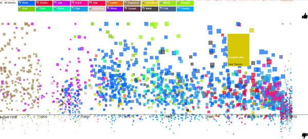 Musicovery ist einer dieser Dienste, bei denen man nach Stimmung und/oder Intepreten eine Playlist zusammen gestellt bekommt. Wirklich interessant wird’s jedoch bei deren Music Map. Die zeigt nämlich die Songs an, die von den Usern am klarsten geliked oder disliked wurden (in Relation zu den Dislikes/Likes). Heraus kommt ein schickes Spielzeug, bei dem man sich durch Genres und Jahrezehnte klicken kann.