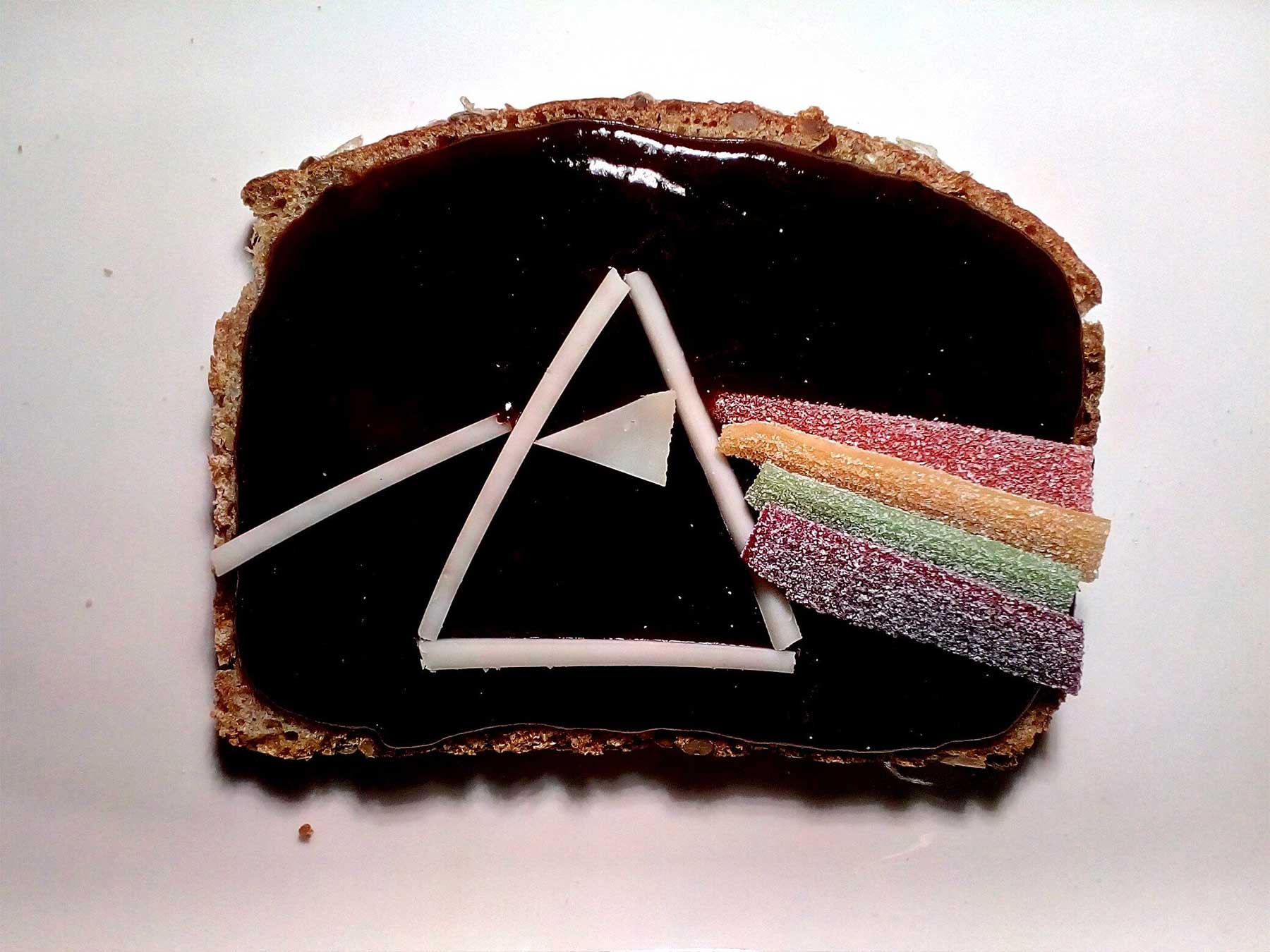 Das obige Pink Floyd-Motiv zu „Dark Side Of The Moon“ stammt von @missmegaphon („Pflaumenmus, Ziegengouda und saure Bänder auf Mischbrot“), alle weiteren Tweets zum Hashtag könnt ihr hier einsehen. Ich habe eine kleine Auswahl meiner Meinung nach besonders schmackhafter Umsetzungen zusammengestellt.