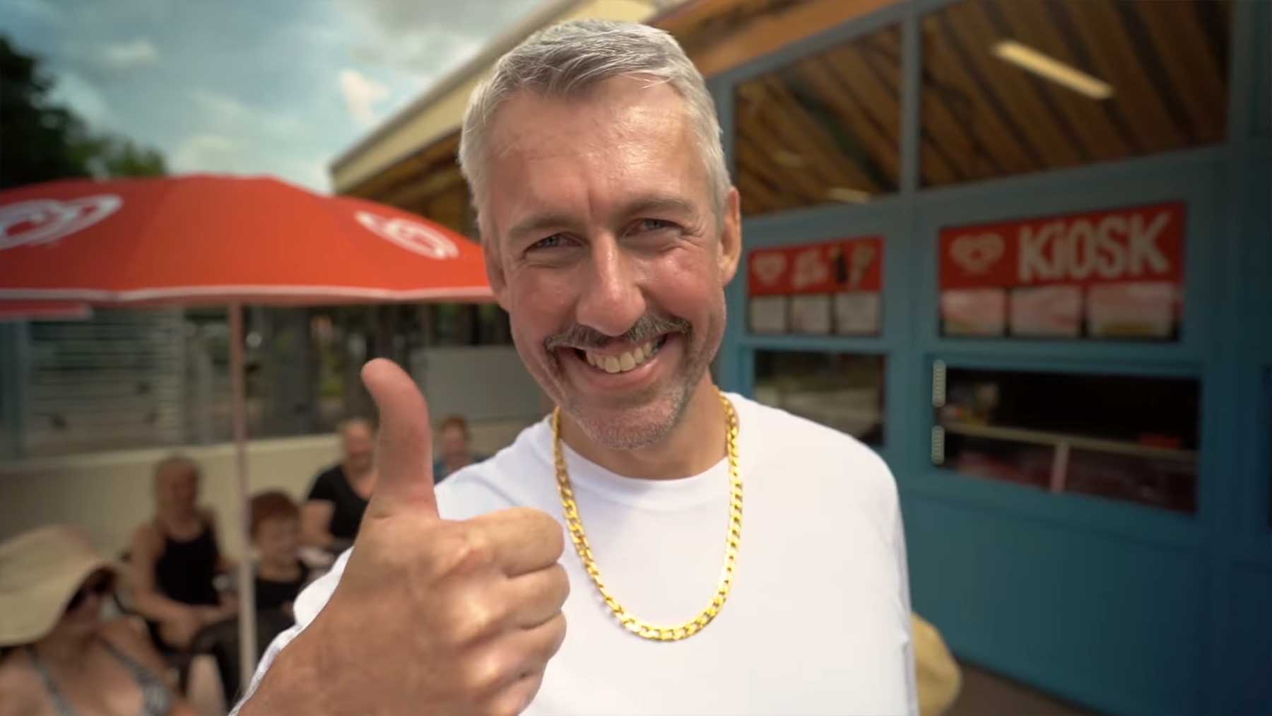 Der Sommer lässt zumindest in unseren Gefilden gerade ungewöhnlich viel Wasser ab, so dass die Freibäder für die Jahreszeit verhältnismäßig leer sein dürften. Mit Blick auf Hitzerekorde und Dürreperioden nehme ich das aber sehr gerne so. Und um mich direkt noch unbeliebter zu machen: Pommes sind auch nicht so meins. Aber im Freibad schmecken die halt anders und besser! Da kann ich schon verstehen, dass man diesen Snack als ein emotionsgeladenes Vehikel ansieht. Grund genug für Kapelle Petra, mit dem Song „Freibad Pommes“ eine Ode an das sommerliche Freiheitsgefühl zu spielen. Im heute veröffentlichten Musikvideo bekommen wir dann auch noch „TV Total“-Moderator Sebastian Puffpaff als Fritten-Verteiler und Bademeister zu sehen. All das ist ein multisensorischer Vorgeschmack auf das am 12. Januar 2024 erscheinende neue Kapetra-Album „HAMM“ (Partnerlink) – wenn da kein Song über Zugteilungen drauf sein wird, bin ich enttäuscht. Guten!