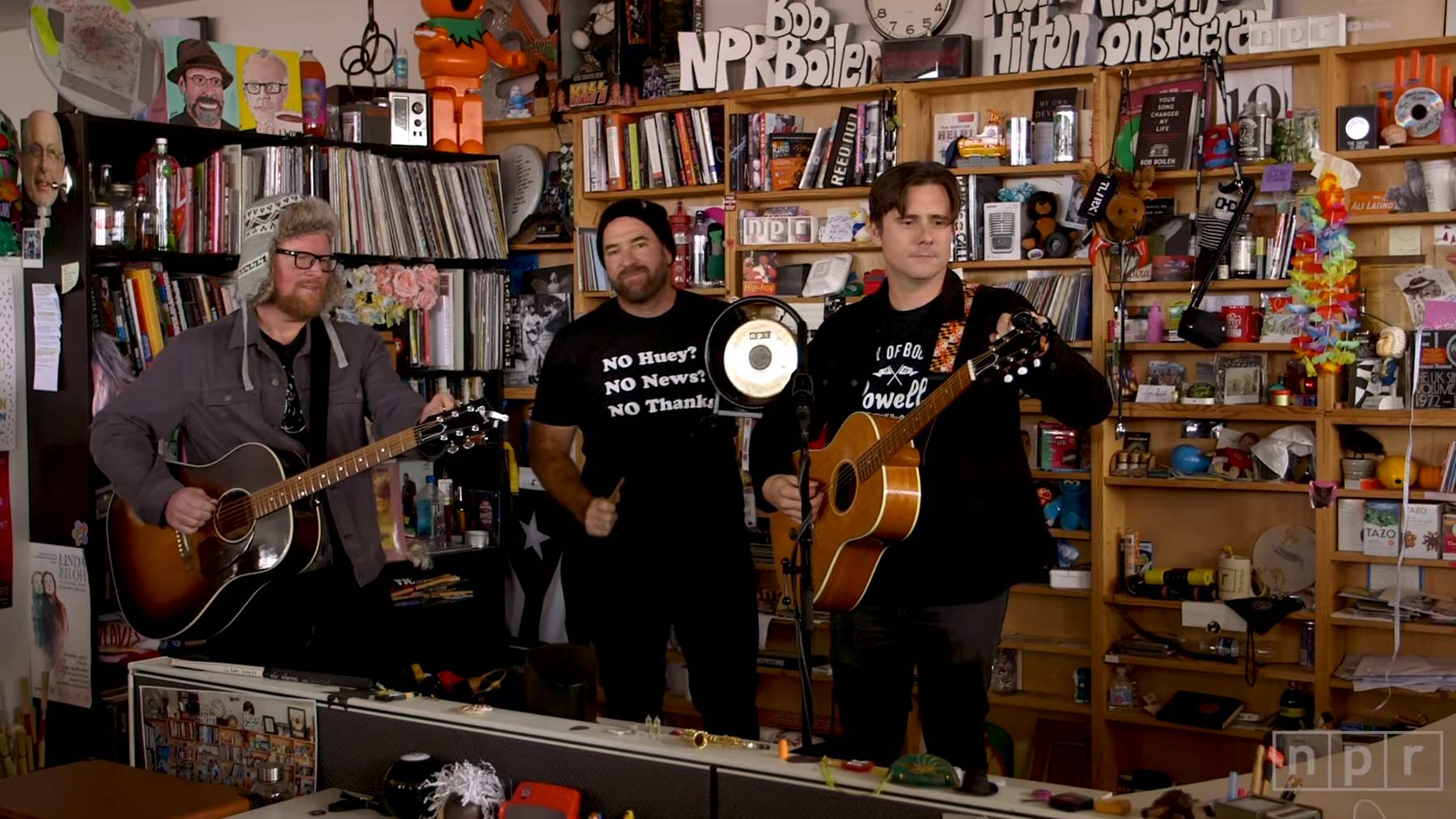 „Jimmy Eat World showed up to the NPR Music office all smiles and no guitars, goofing off with toy instruments behind the Tiny Desk and cracking jokes. They borrowed a couple acoustics, a miniature gong and tambourine emblazoned with Bob Boilen’s face, which set the tone for a slightly silly, but altogether gracious performance.“
