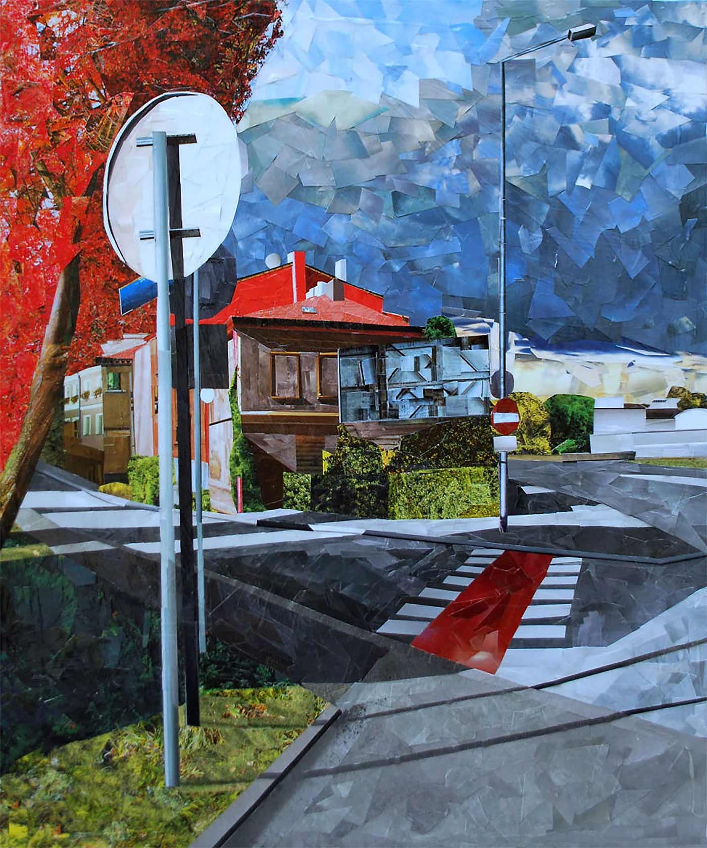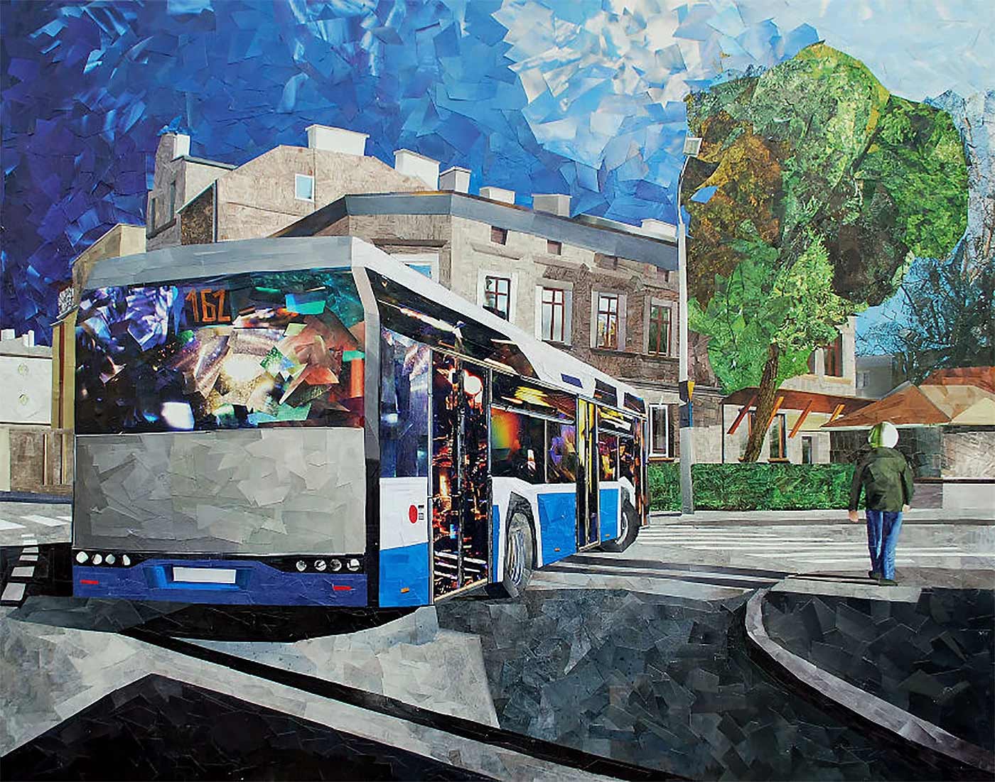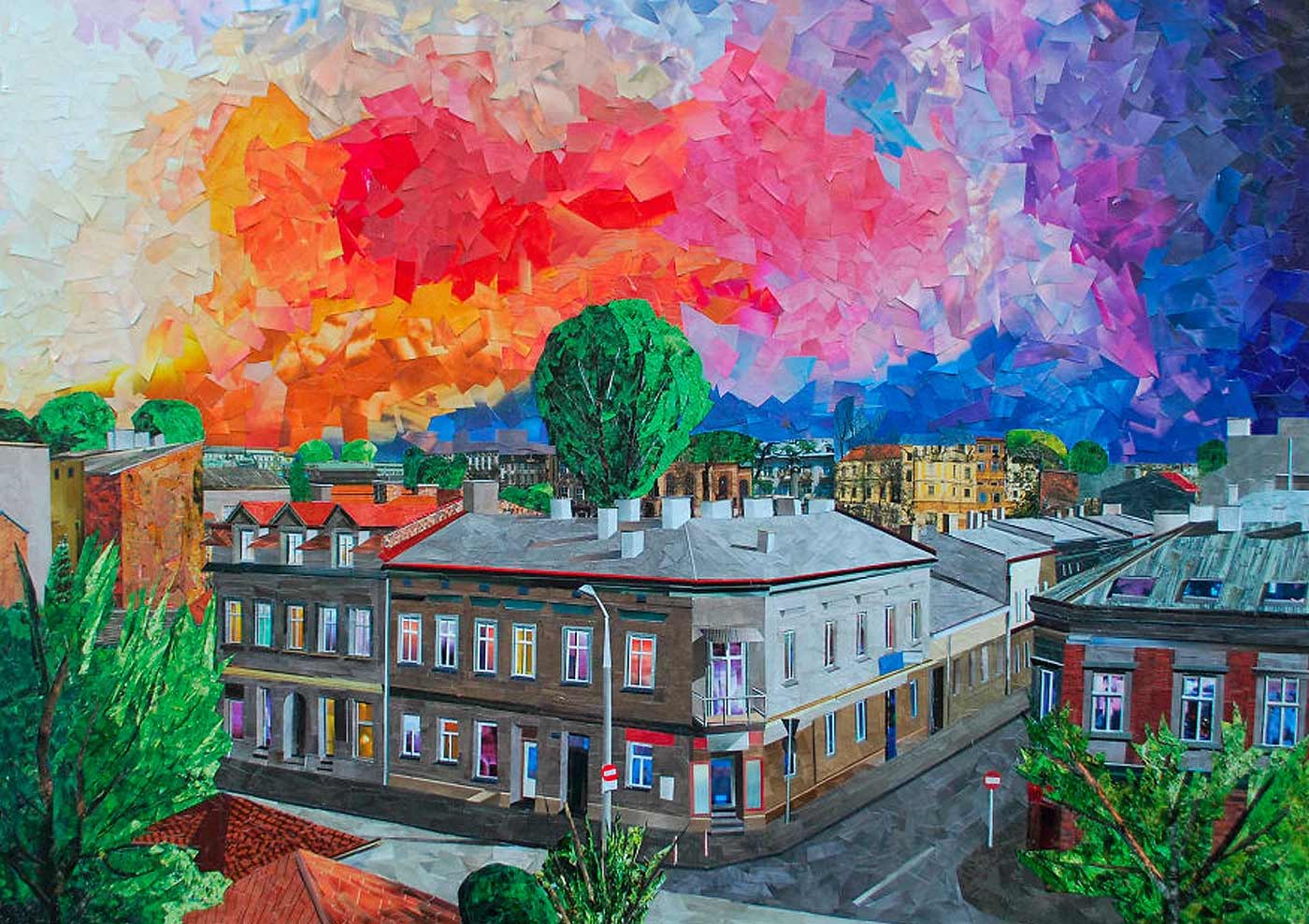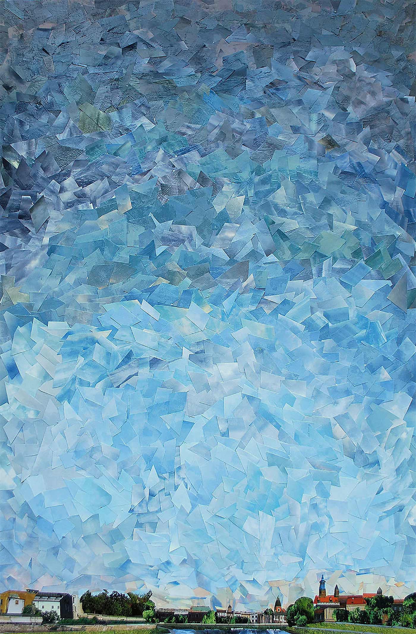 Was hier wie ein grober Pinselduktus impressionistischer Malerei anmutet, ist Papier. Lauter Papier. Und vor allem mühevolle Kleinstarbeit. Zwischen einer Woche und einem Monat sitzt Albin Talik aus Polen jeweils in etwa an einem dieser Werke, die kleinteilige Collagen etlicher kleiner Papierschnipselchen sind.