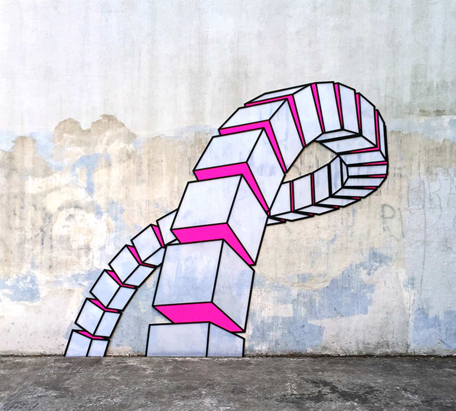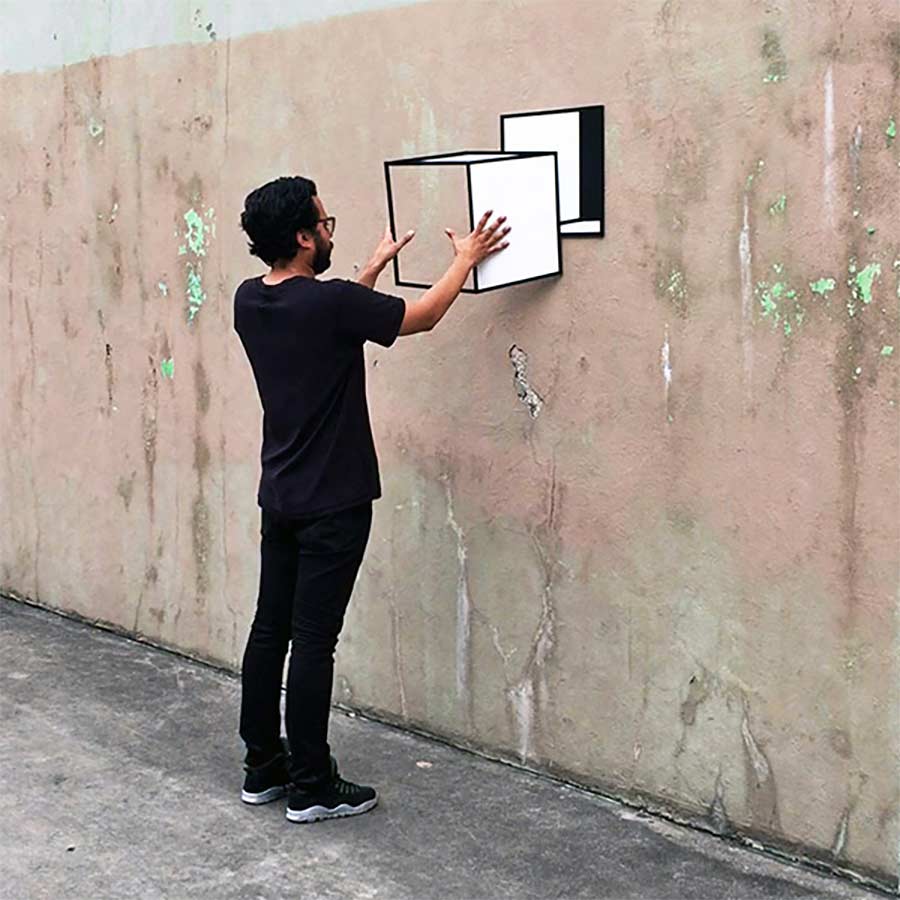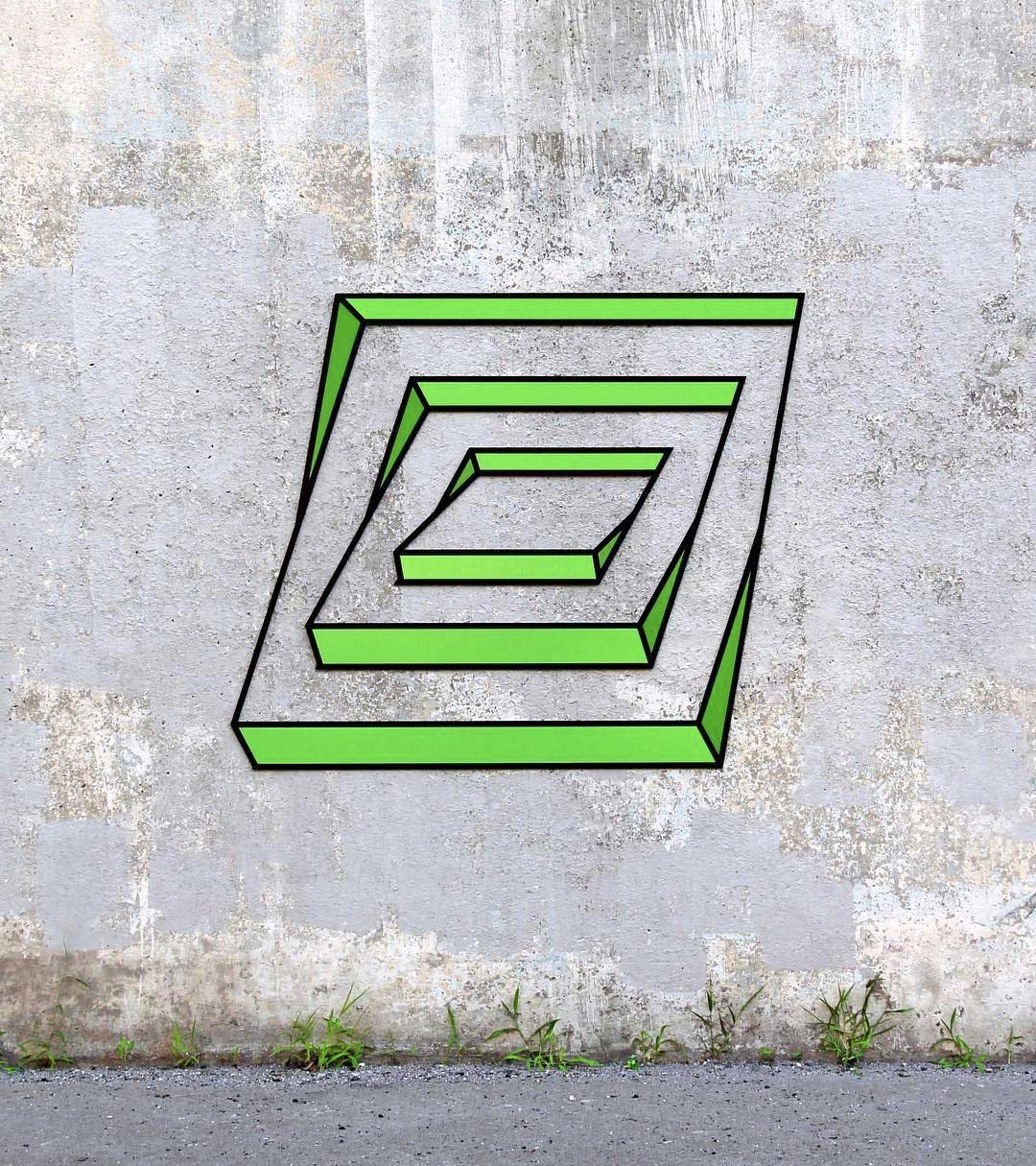 Vor sieben(!) Jahren hatte ich bereits etwas zu den Tape-Arbeiten von Aakash Nihalani geschrieben. Seitdem hat der New Yorker fleißig weiter geometrische Figuren an Wände und Böden gezaubert, die wunderbar mit unseren Synapsen spielen.