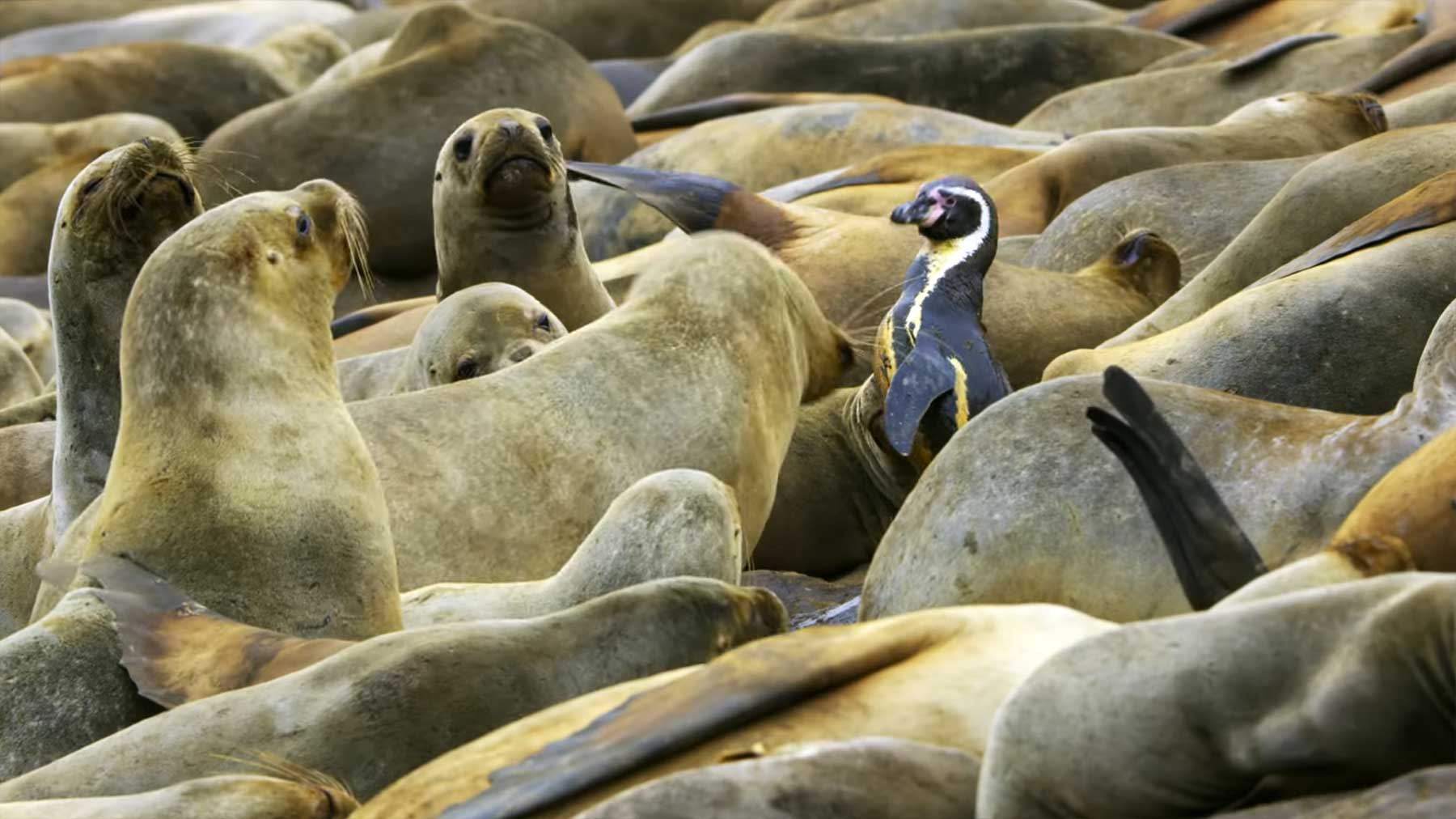 „To get to the sea, these Humboldt penguins have to squeeze through a rowdy crowd of Sea Lions… which proves to be tricky.“