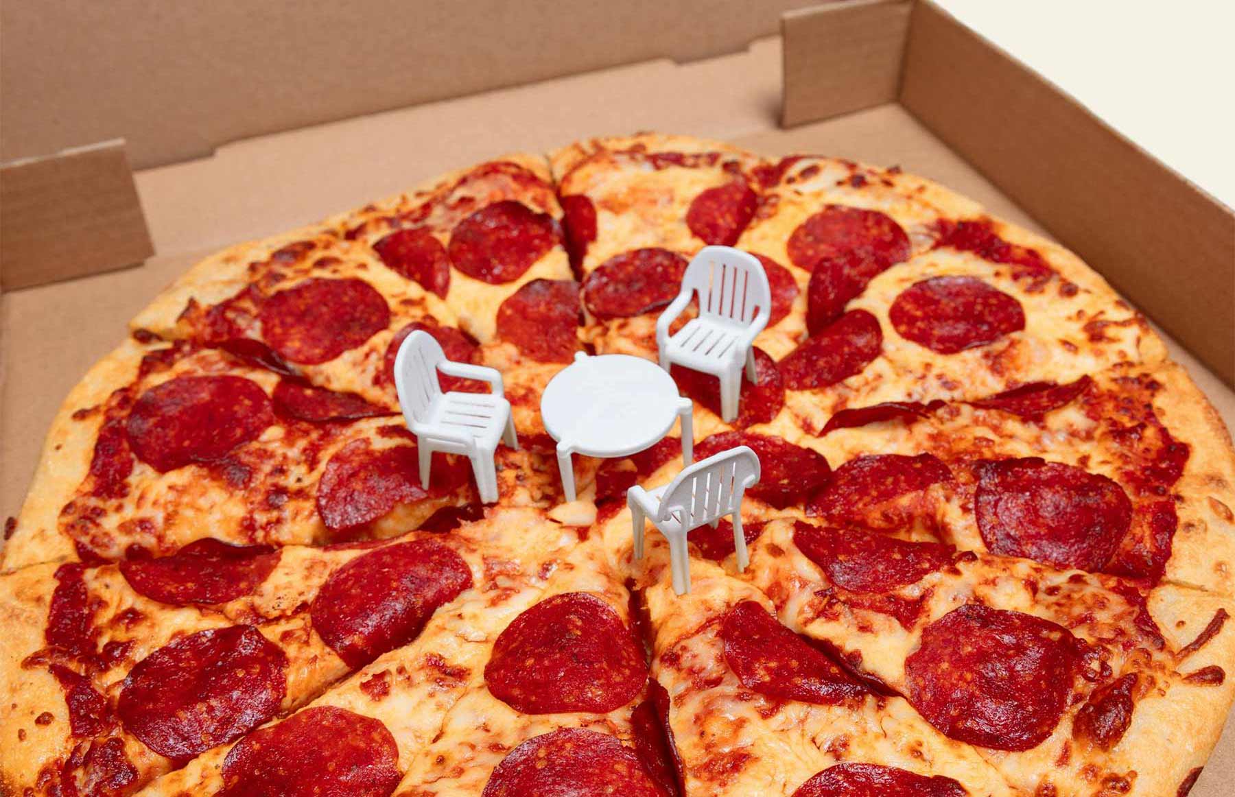 Was für eine herrliche Idee ist das denn? Vor allem in den USA sind die Pizzaabstands-Dinger seit Jahren ein absoluter Heilsbringer, wenn es darum geht, flüssigen Käse vom Anpappen an der Innenseite des Pizzaschachteldeckels abzuhalten. Jetzt kann man den kleinen zentralen Nöpsi quasi als Tisch eines Miniatur-Möbelsets sehen – einfach die passenden Plastikstühle per 3D-Druck erstellen. Das hat die kanadische Pizzakette „Boston Pizza“ in Zusammenarbeit mit der Kreativagentur „john st.“ gemacht.