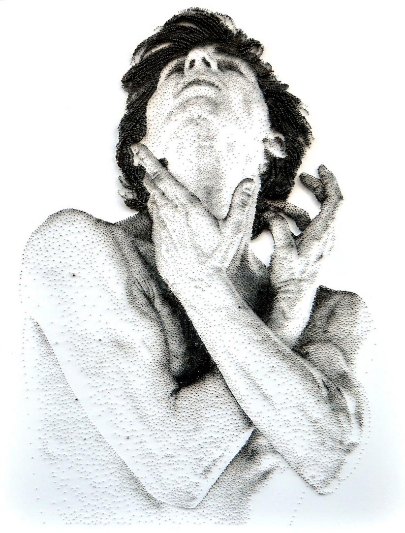 „I am a sculptor of the human physique and I use nails to create my sculptures. These artworks take me weeks, sometimes even months to finish and I use thousands of nails. I translate my ideas onto large white wooden panels by hammering the nails at varying heights and distances to create the tone and texture. The majority of my ‘nail sculptures’ are representations of the human form. My figurative interest is in the lines we create.“