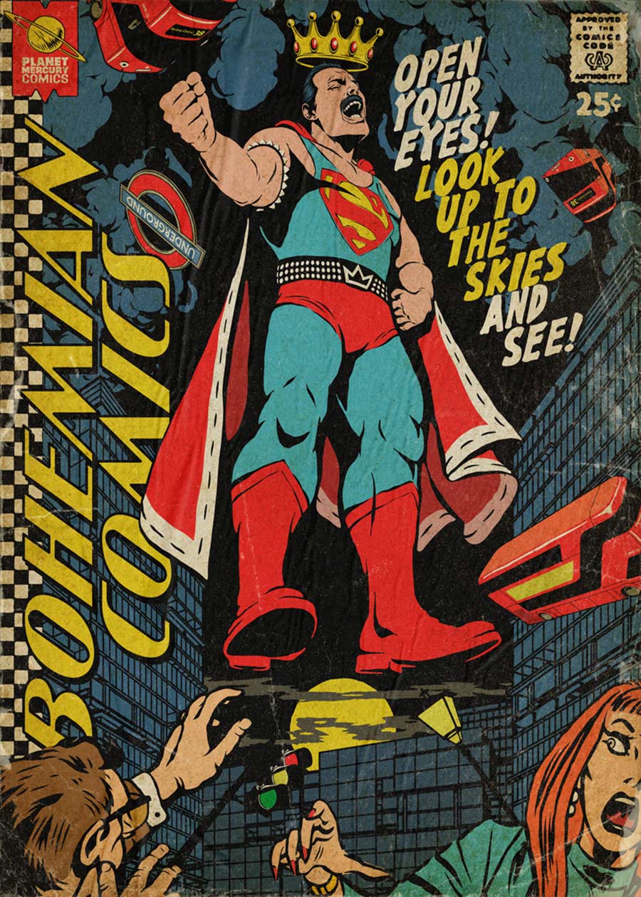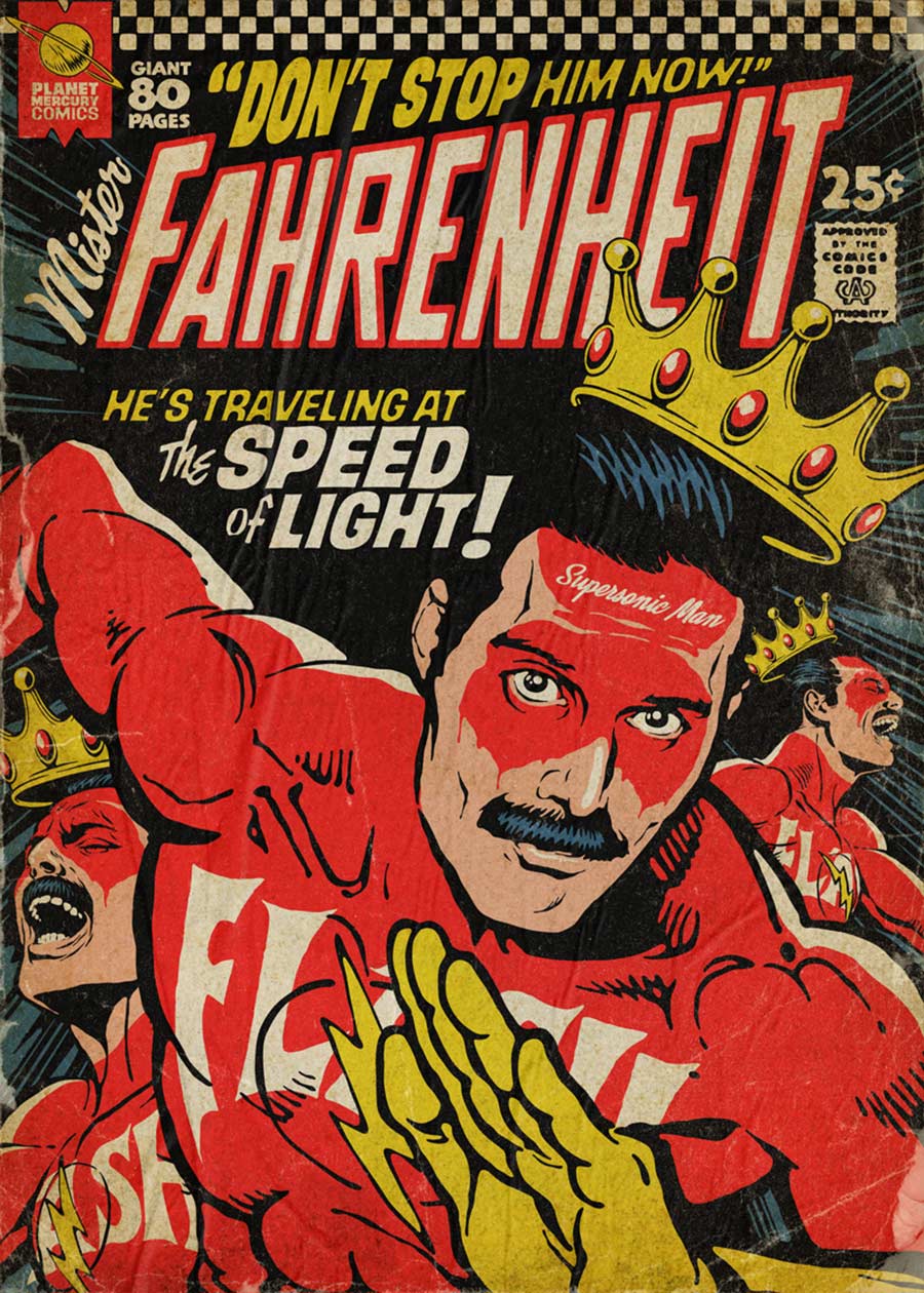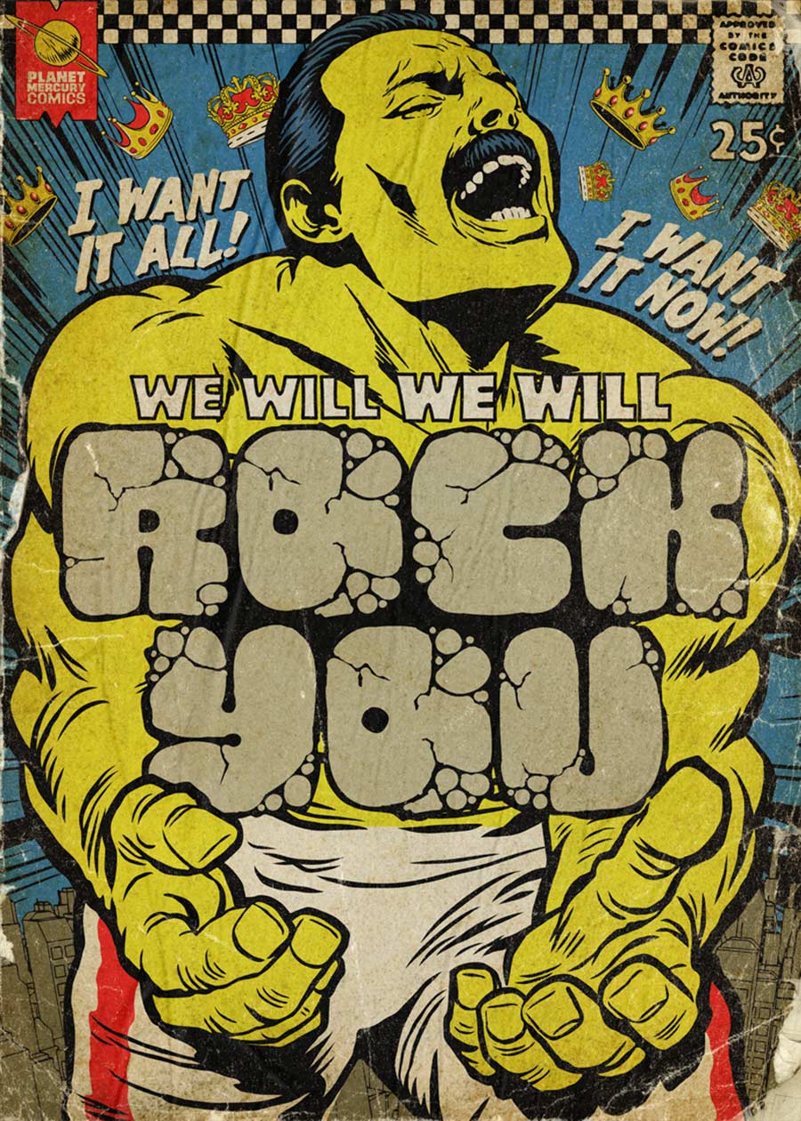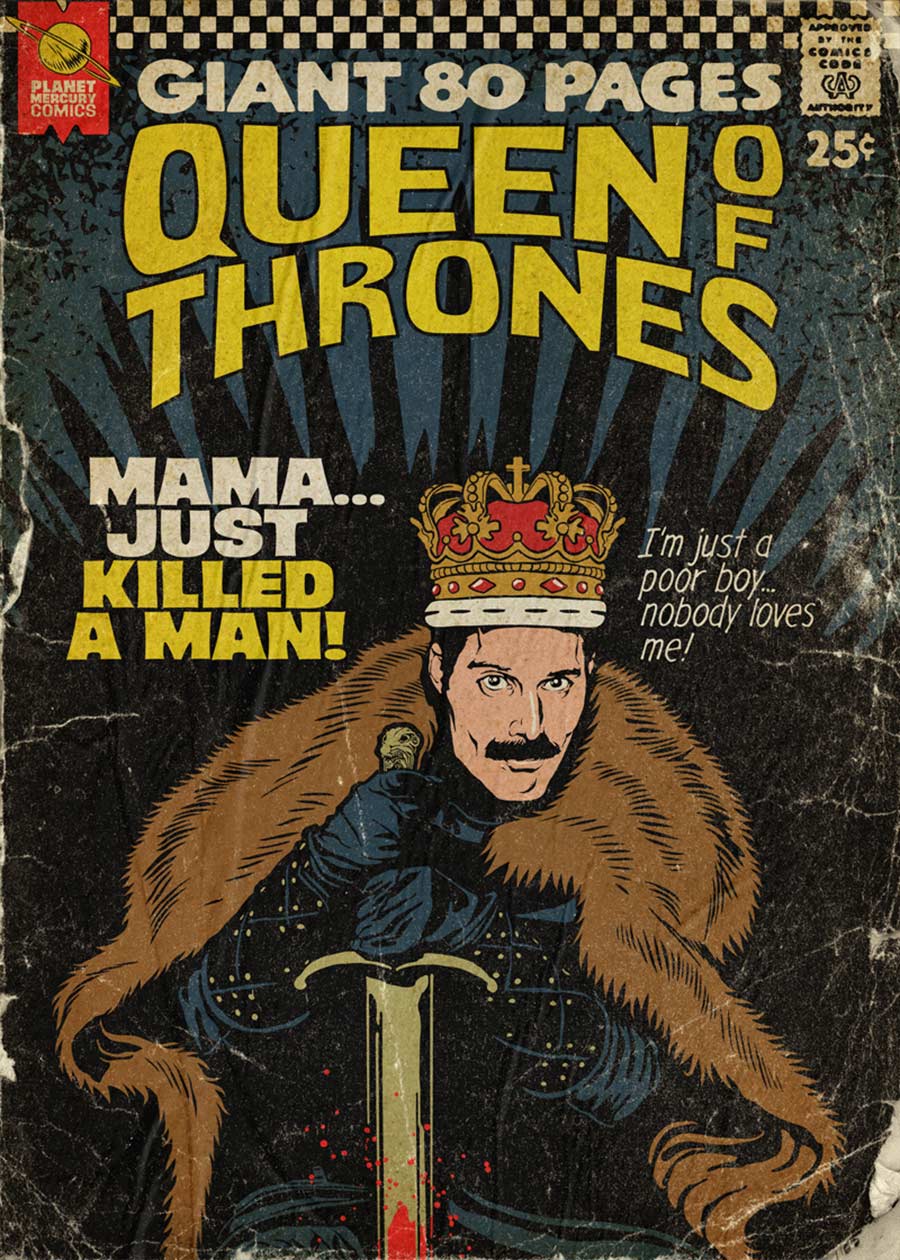 Der gute alte Butcher Billy hat mal wieder zugeschlagen und ein Stück Popkultur-Mashup gezaubert. Nach u.a. den Liebeslidern als Horror-Buchcovern und den alten Musik-Ikonen, die Bandshirts moderner Acts tragen, werden erneut Musik und Illustration gemixt. Der mit bürgerlichem Namen Bily Mariano Da Luz heißende Digitalkünstler hat den Queen-Revival-Zug betreten und einige der bekanntesten Songs der Band in Comicbände umgewandelt. „Planet Mercury Comics“ macht aus Freddie einen Superhelden und hält plakative Comicbuch-Cover-Motive, die „We Are The Champions“, „Under Pressure“ und Co. eine visuelle Note verleihen, für uns parat. Tolle Idee mit teils richtig starken Umsetzungen, vor allem, was die kleinen geschriebenen Bylines auf den Covern anbelangt.