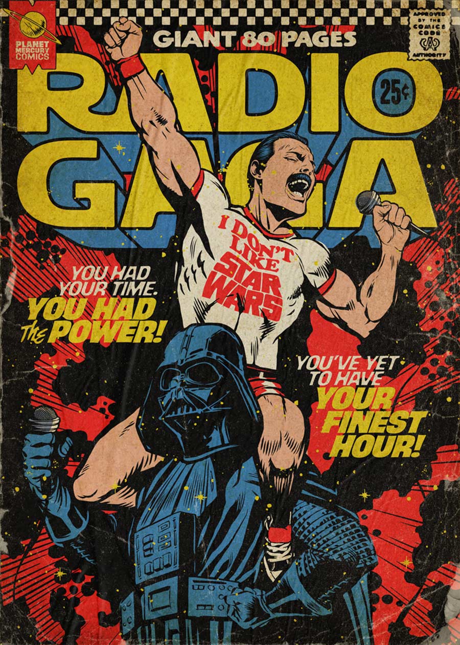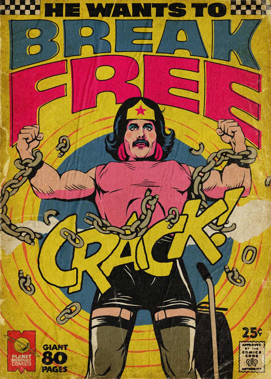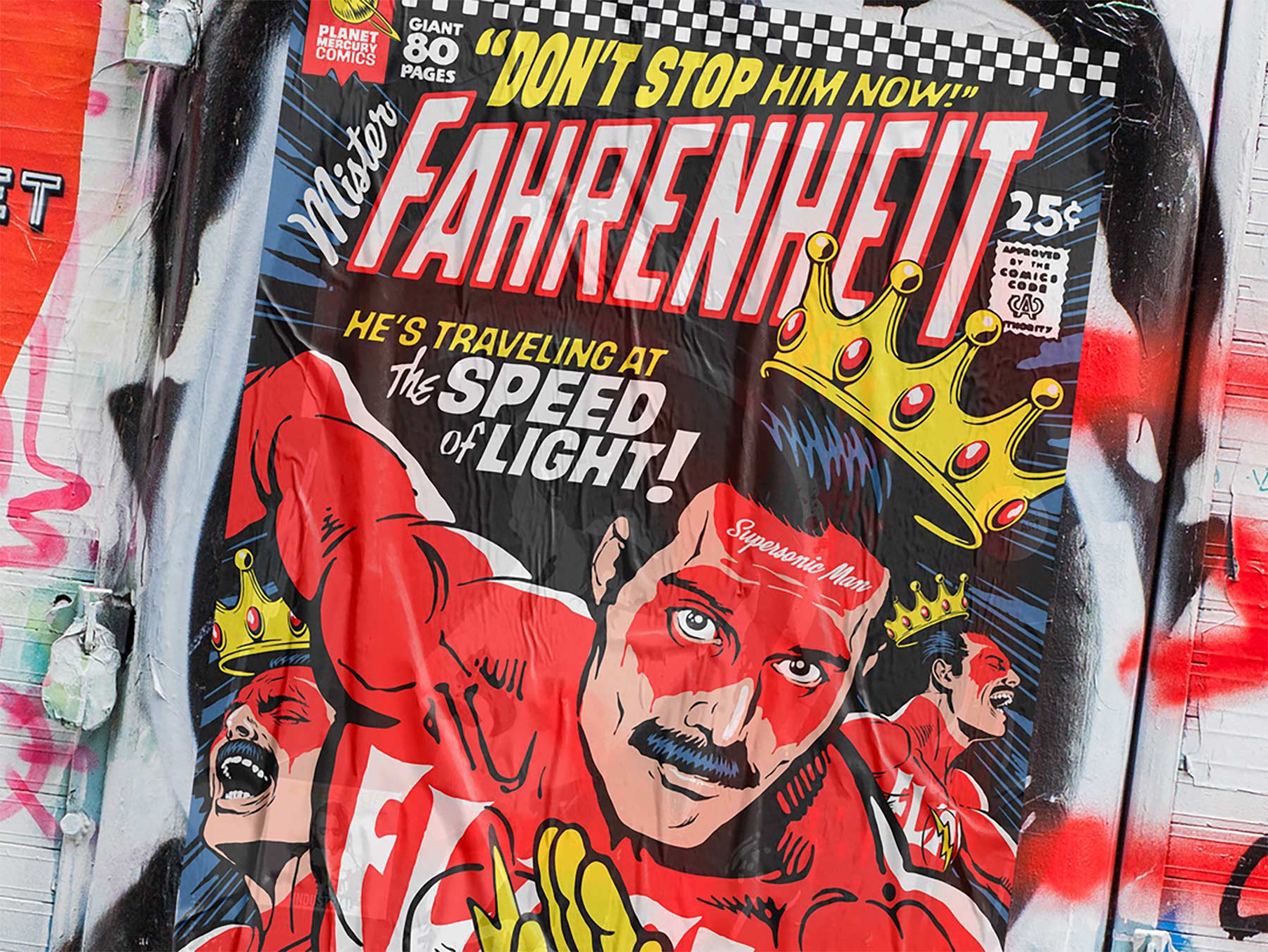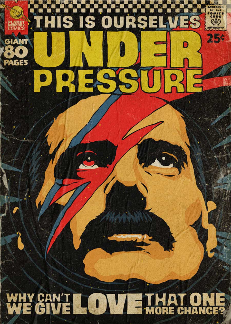 Der gute alte Butcher Billy hat mal wieder zugeschlagen und ein Stück Popkultur-Mashup gezaubert. Nach u.a. den Liebeslidern als Horror-Buchcovern und den alten Musik-Ikonen, die Bandshirts moderner Acts tragen, werden erneut Musik und Illustration gemixt. Der mit bürgerlichem Namen Bily Mariano Da Luz heißende Digitalkünstler hat den Queen-Revival-Zug betreten und einige der bekanntesten Songs der Band in Comicbände umgewandelt. „Planet Mercury Comics“ macht aus Freddie einen Superhelden und hält plakative Comicbuch-Cover-Motive, die „We Are The Champions“, „Under Pressure“ und Co. eine visuelle Note verleihen, für uns parat. Tolle Idee mit teils richtig starken Umsetzungen, vor allem, was die kleinen geschriebenen Bylines auf den Covern anbelangt.
