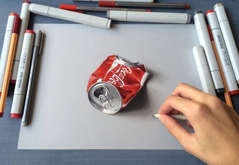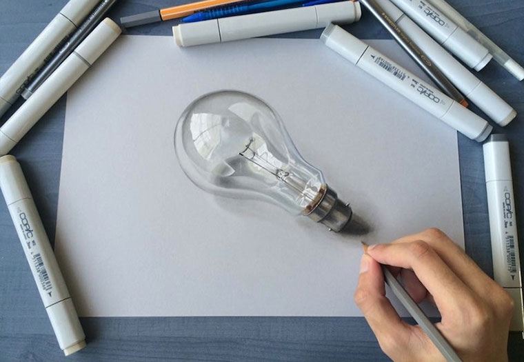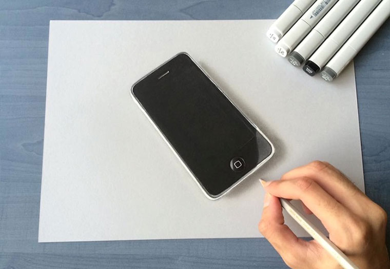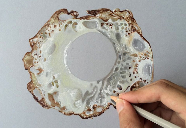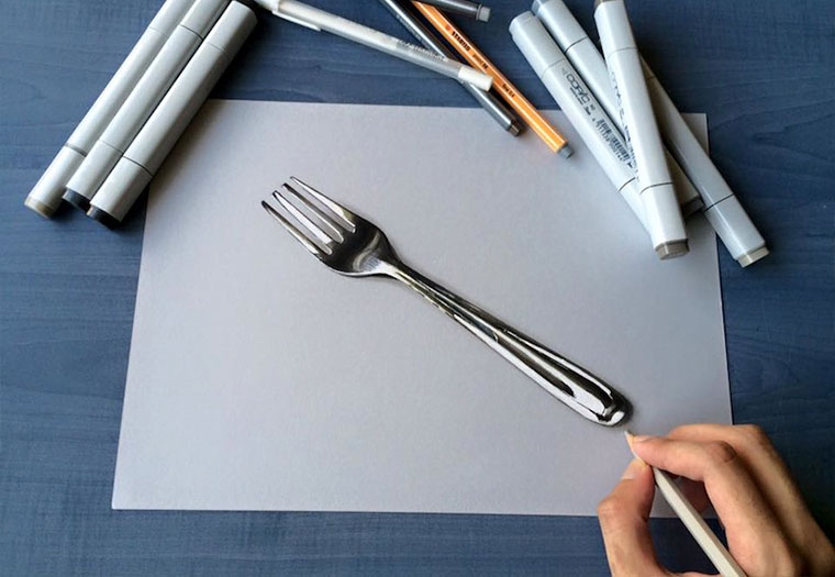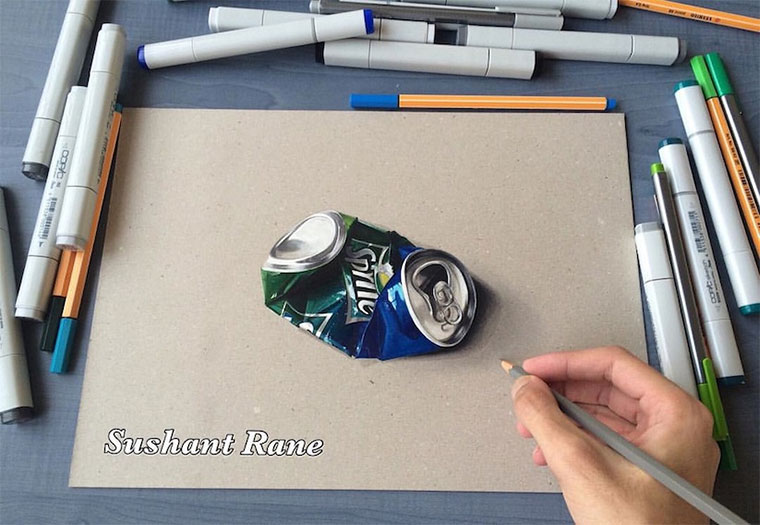Eigentlich verdammt langweilige Dinge, die es hier zu sehen gibt. Ein Glas auf einem Blatt Papier? Eindrucksvoll… Zumindest, wenn es auf diese perfekte Art und Weise gezeichnet wurde, wie Sushant S Rane es macht. Perfekte perspektivische Darstellung, Schattierung, Beleuchtung und hier und da sogar mit Tiefenschärfe-Effekten. Beeindruckende Kleinkunst des Autodidakten. Mir gefällt dabei auch, dass es immer mal wieder Zwischenschritte des Zeichen-Prozesses zu sehen gibt.