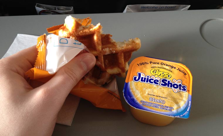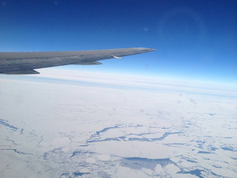 Die Reiseroute war relativ simpel. Zunächst ging es am 19. Januar über Amsterdam und Atlanta nach Miami. Alte Maschine, nur Fernseher im Gang (die kleine Filmkritik: New Years Eve langweilig, Liberal Arts ganz gut), Essen okay. Aller Reisenden und Gepäckstücke wohlbehalten angekommen, ist doch auch schon einmal was. Hier unser Frühstück durch KLM, gefolgt von einem Blick auf Kanada: