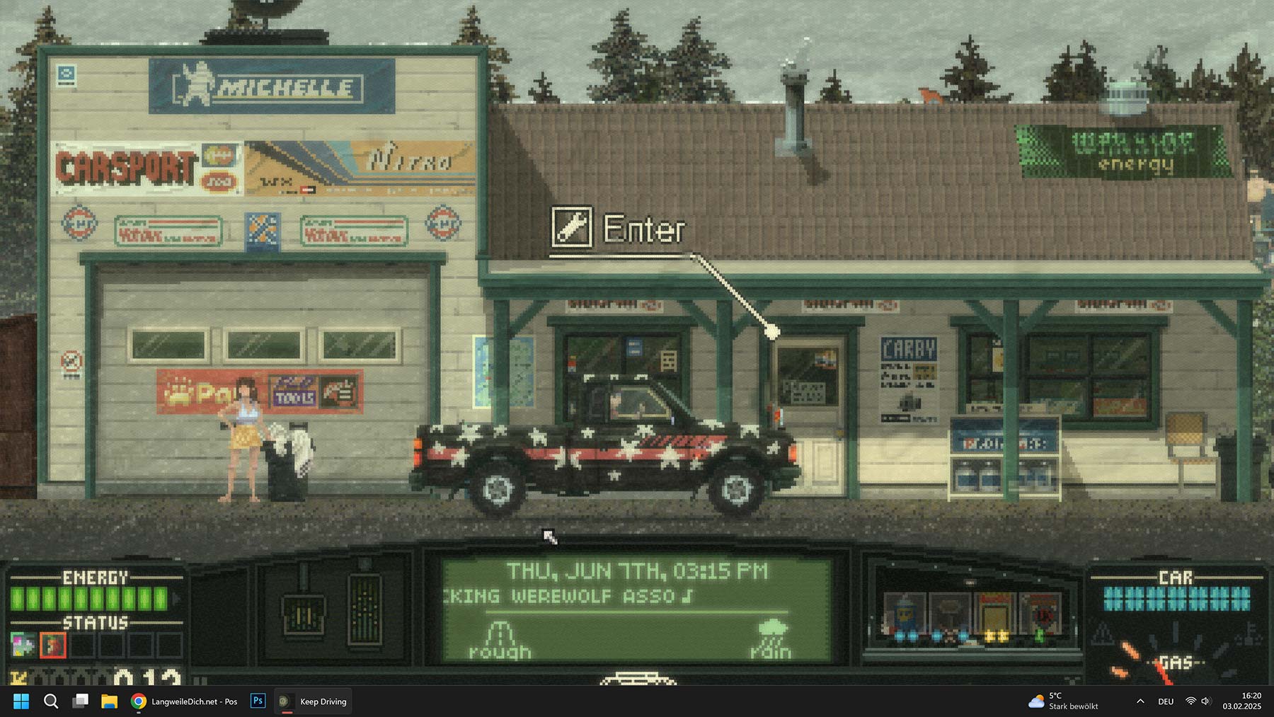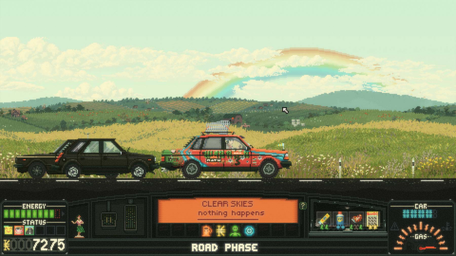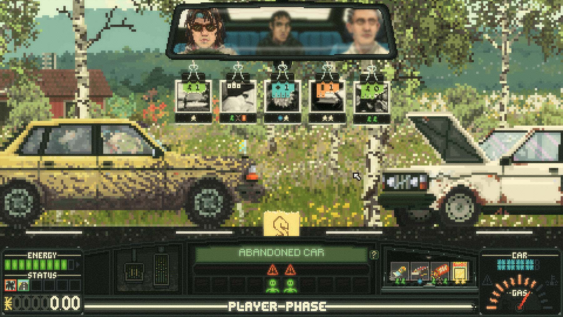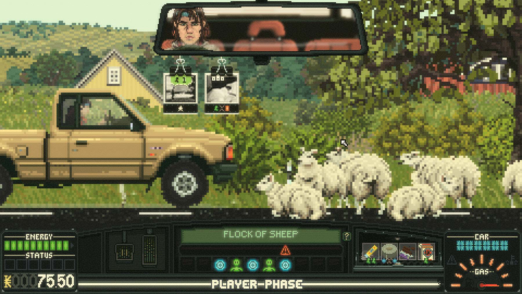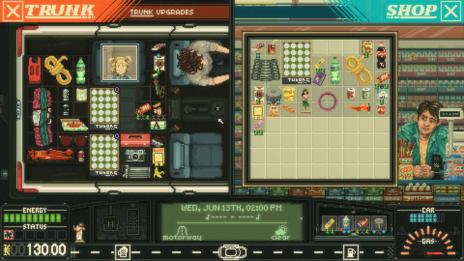 Beim Kaufen von Proviant oder neuen Teilen für das Auto kommt eine weitere Stärke von „Keep Driving“ zum Vorschein. Zum einen muss man durchaus ein gewisses „Tetris“-Talent mitbringen, vor allem aber spornt das Spielsystem an, das Beste rauszuholen – sowohl für das Fahrzeug als auch für sich selbst. Nahrungsmittel braucht es gegen Müdigkeit und Hunger, Gegenstände im Handschuhfach helfen gegen die Straßen-Bedrohungen und diverse Sondergegenstände wissen für Missionen, Such-Spaziergänge oder andere Begebenheiten von Vorteil zu sein. Hinzu kommt eine Art rudimentäres Tuning-System, mit dem man sein Auto verbessern kann. Neben ästhetischen Verbesserungen kann man so auch Einfluss auf Bedrohungen nehmen, vor allem im Zusammenspiel mit erlernten Fähigkeiten lässt sich manch eine symbiotische Verbindung erstellen. Leider lassen sich nur sehr begrenzt Verbesserungen einbauen. Möchte man gerne diese Bremse und jene Motorenverbesserung einbauen, muss man leider feststellen, dass viele Gegenstände auf den einen selben Bauplatz gehören. Zu gerne würde man sein Auto mehr und mehr aufmotzen, das ist ein bisschen schade. Aber mit der Zeit wird einem auch klar, dass es das eigentlich gar nicht benötigt. Dafür sind die Ausflüge nämlich eigentlich viel zu kurz.