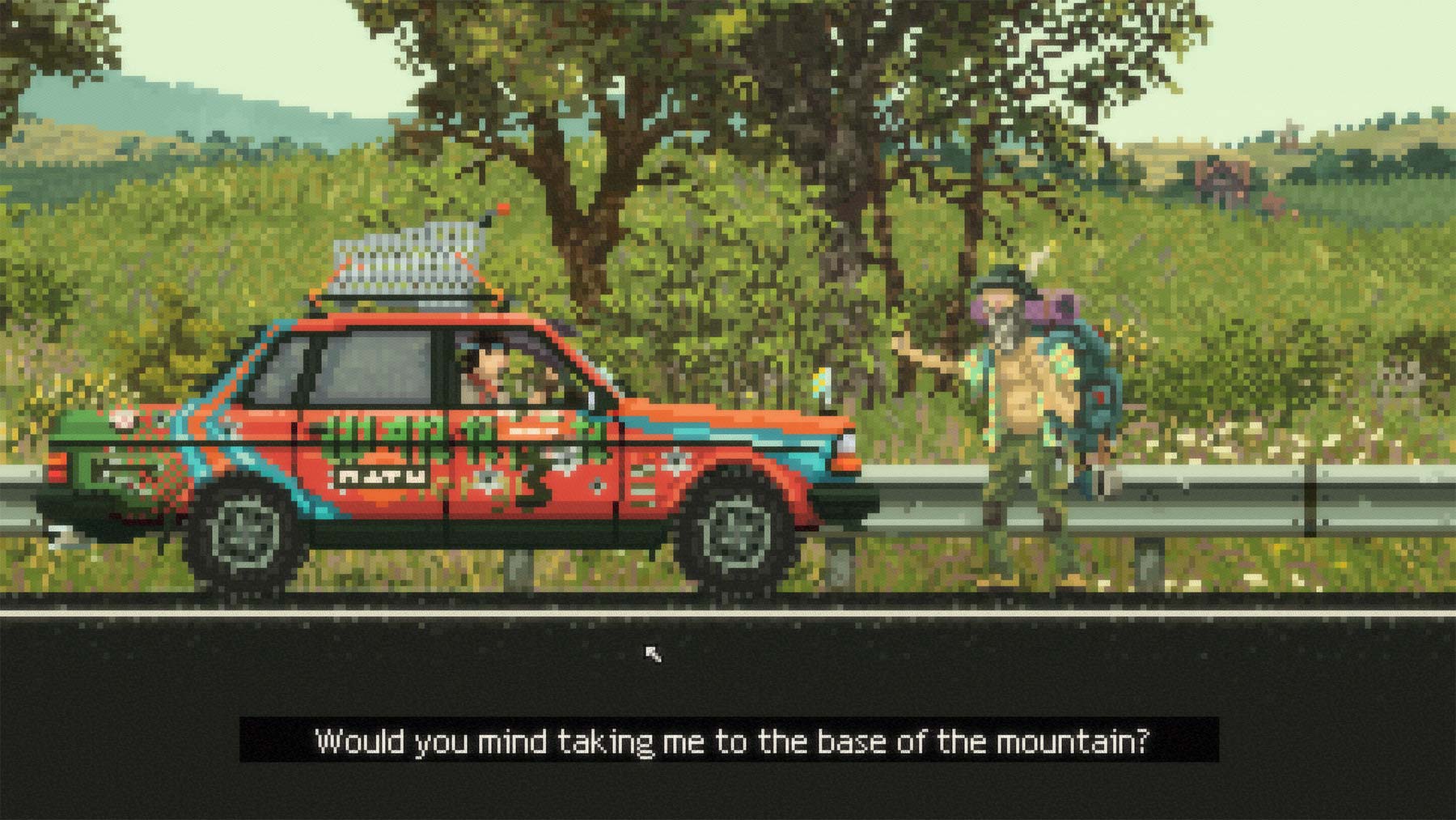 Für Abwechslung sowie Unterstützung im Kampf gegen die Wagnisse der Straße sorgen Anhalter:innen. Regelmäßig bieten sich bunte Gesell:innen für die Mitfahrt an, bei denen ihr entscheiden könnt, ob ihr sie mitnehmen wollt. Falls ja, erhaltet ihr nicht nur vereinzelte Gesprächsfetzen während der Fahrt, sondern auch eine Person, die eigene „Lösungsmuster“ für die kleinen Problem-Bewältigungs-Battle bietet. Und ein Missionsziel, das euch Belohnungen sichert, das an eine Geschichte geknüpft ist, die das bloße Herumfahren deutlich aufwertet.