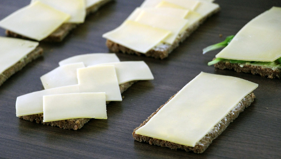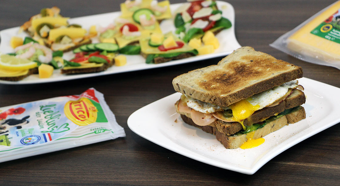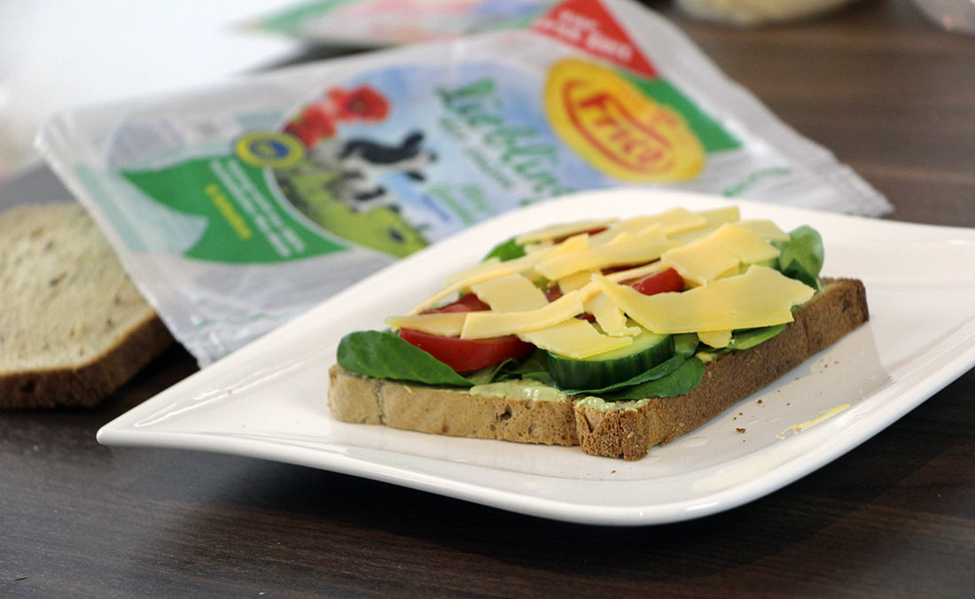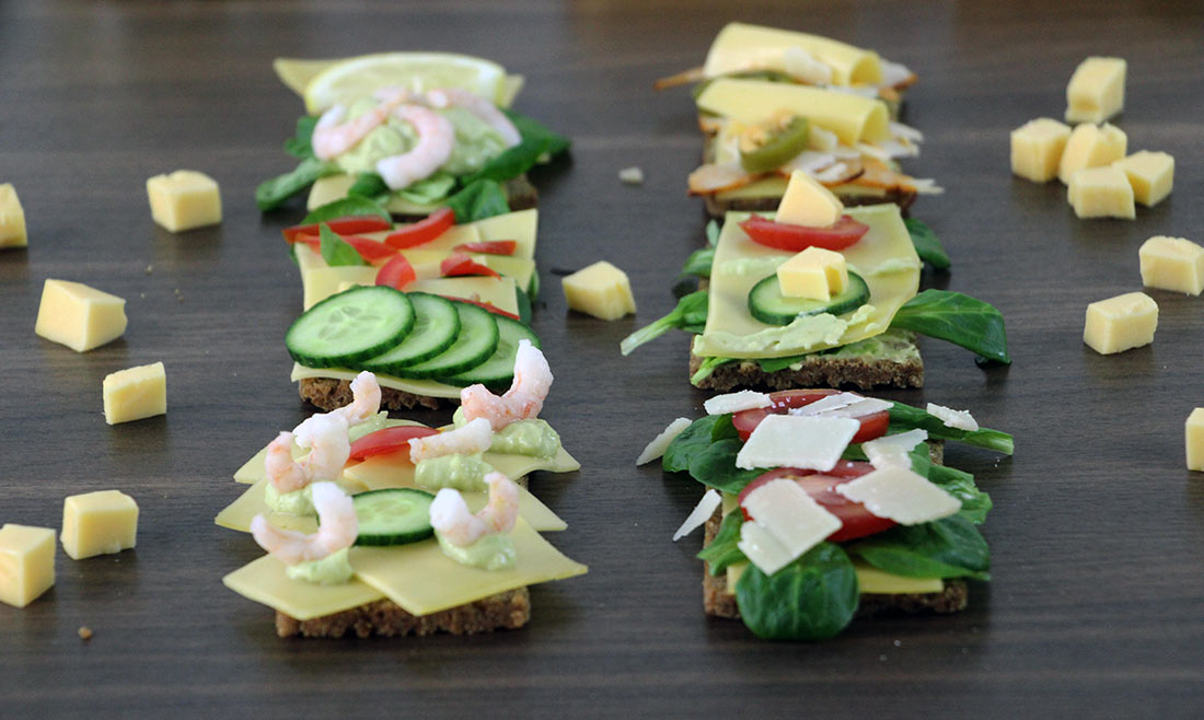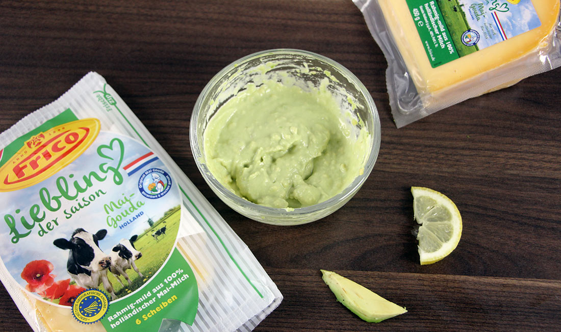 Seit 13. Juni gibt es den Mai-Gouda als Fricos „Liebling des Frühlings“ im Kühlregal. Ich habe mich bei der Käseschnitten-Kunst für die Scheiben-Variante entschieden und diese auf unterschiedliche Vollkorn-Brotscheiben über den Avocado-Aufstrich, Margarine oder nichts mal mehr, mal weniger kunstvoll drapiert. Abwechslungs ist König, damit eure Gäste (oder Augen) beim Futtern nicht aus dem Staunen heraus kommen (bzw. sich nicht langweilen).