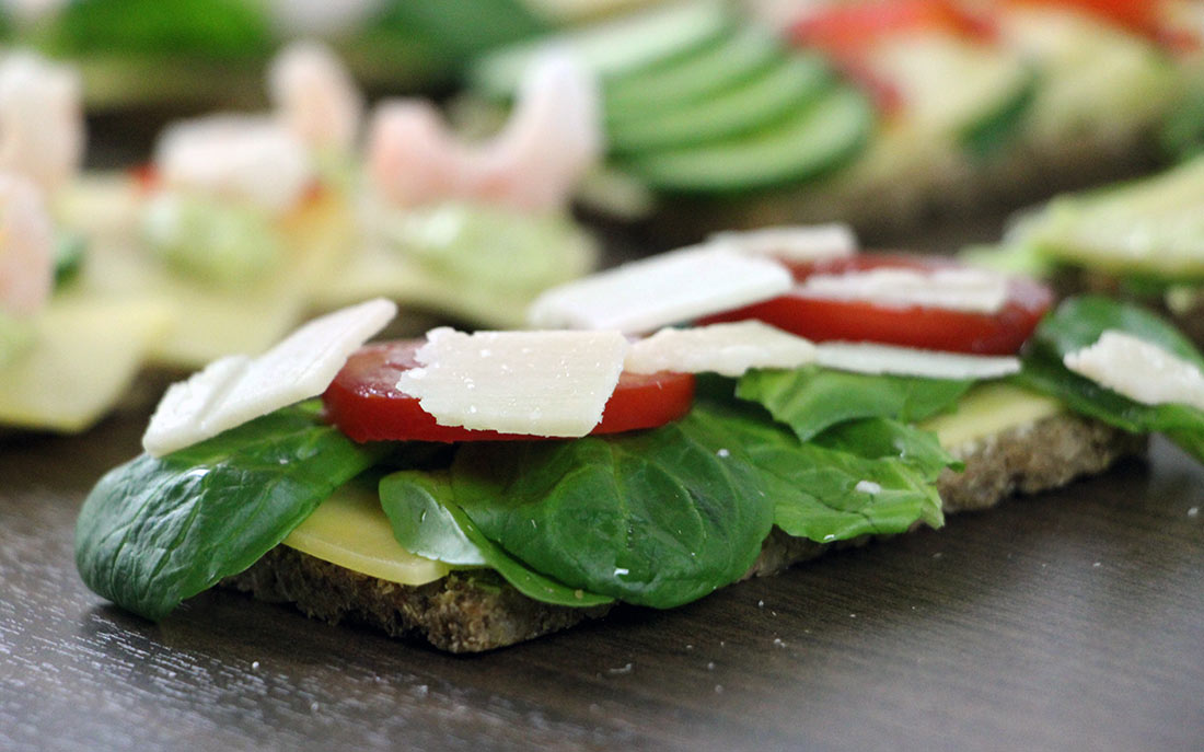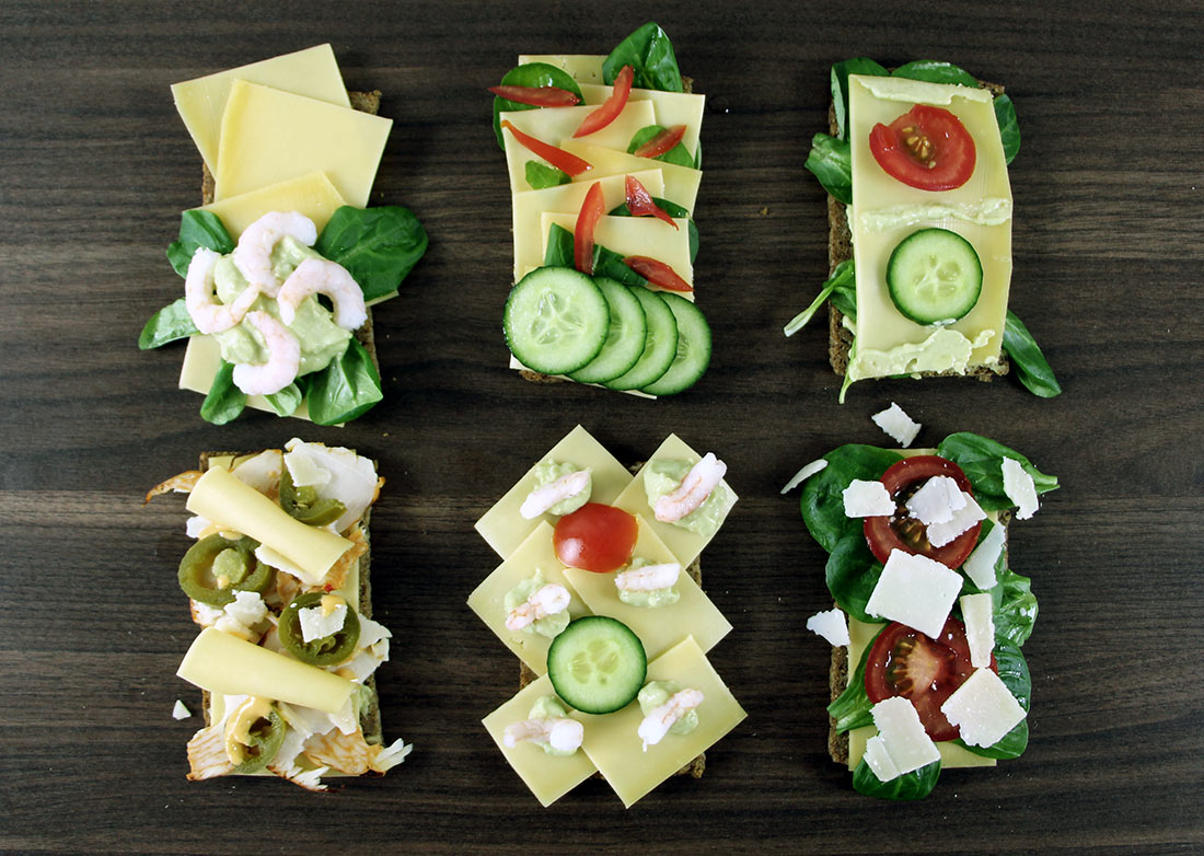 Dann haut ihr alles drauf, was ihr im Kühlschrank findet. Salat, Obst, Garnelen, Lachs, Schinken, mehr Käse, Jalapenos, Gurken, mehr Käse, Tomaten, Avocado-Creme oder einfach noch mehr Käse. Ganz nach Lust und Laune. Und denkt dran: Das Auge isst mit – immerhin verkaufen dänische Imbisse die Teile für mehrere Euros, da muss schon Handwerkskunst am Brotbau stattfinden!