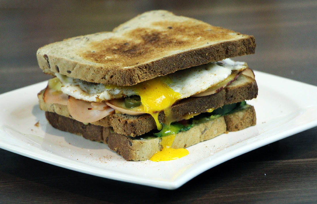 Ein Gebilde für die Götter! Vor allem, wenn man es schafft, beim Zerschneiden des Sandwiches in zwei handgerechte Hälften genau das noch flüssige Ei-Dotter zu zertrennen – himmlisch! Hat mir ungemein gut geschmeckt, aber hier war ich einfach nur froh, als ich endlich reinbeißen konnte. Hach!