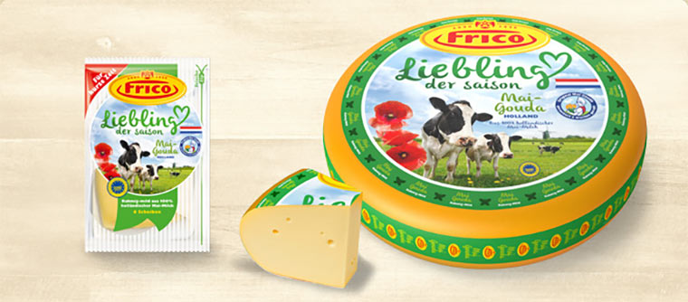 „Wenn im Mai die Sonne an Kraft gewinnt, lieben es auch unsere Kühe, wenn sie wieder viel Zeit draußen auf den saftig grünen Wiesen verbringen können. Jetzt käsen unsere Käsemeister aus der leckeren Mai-Milch unseren Mai-Gouda Holland g.g.A. – den holländischen Klassiker zart & sahnig im Geschmack, purer Gouda-Genuss, der im Mund zergeht!“