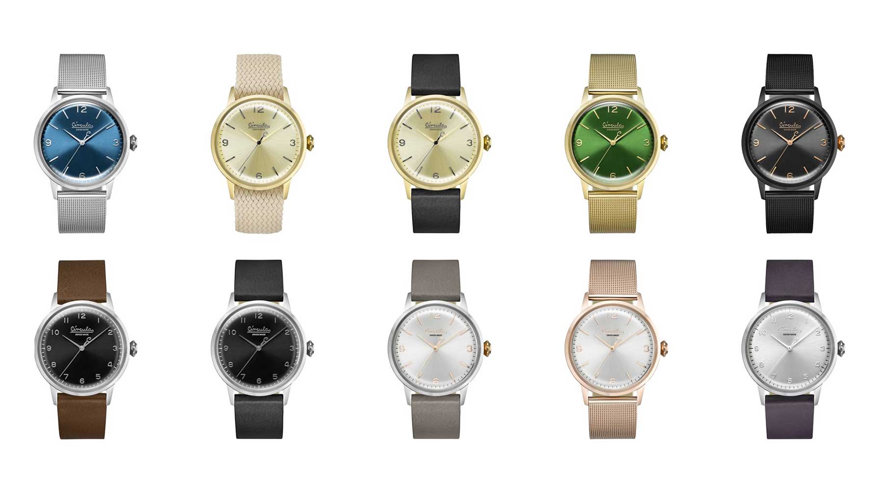 Zur Auswahl stehen im Online Shop aktuell zehn Modelle, die sich vor allem in Färbung und Armband unterscheiden. Gold, Braun, Schwarz – alles bleibt im klassischen Rahmen und bietet doch Abwechslung. Dazu gibt es ein Leder-, Milanaiseband- oder Perlonband. In puncto Ziffernblatt stechen ein paar Exemplare dadurch heraus, dass sie alle Stundenzahlen präsentieren, während die übrigen nur die Quartale indizieren.