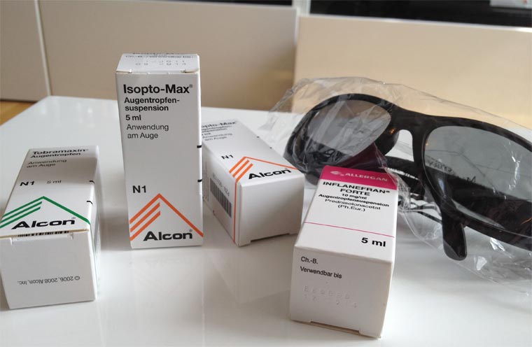 Seit heute muss ich mehrfach täglich die Augen tropfen. Das lindert auch nicht unbedingt den Adrenalinpegel. Fünffach vor der OP, vierfach danach, dann für mehrere Wochen.